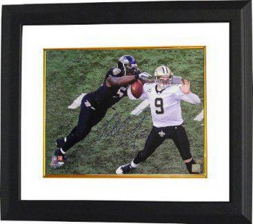 Terrell Suggs was drafted by the Baltimore Ravens with the Tenth overall Pick in the 2003 NFL Draft. Suggs' enjoyed immediate success in his rookie year, as he recorded 12 sacks and 1 interception and earning Defensive Rookie of The Year honors while playing the left outside linebacker position in Baltimore's 3-4 defensive scheme. Suggs was key in the Ravens win over the Denver Broncos in the divisional round of the playoffs with two sacks on Broncos Quarterback Peyton Manning, after which, the Ravens advanced to New England in a rematch of the previous year's AFC championship game where they defeated the Patriots 28-13. The win gave Suggs his first ever AFC Championship and his first appearance in the Super Bowl, being Super Bowl XLVII against the San Francisco 49ers. In that game, the Ravens won 34-31, earning Suggs his first Super Bowl ring. Terrell Suggs has hand autographed this Baltimore Ravens 16x20 Photo sacking Drew Brees. Leaf Authentic Hologram and Certificate of Authenticity from Athlon Sports. Custom White Mat and Premium Black Frame as shown.