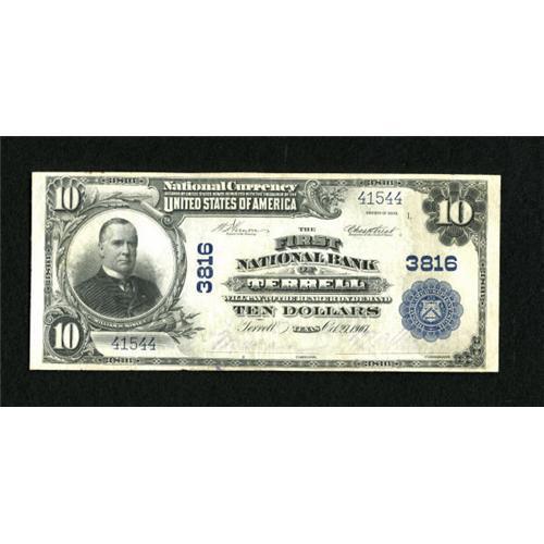 <B>Terrell, TX</B></I> - $10 1902 Plain Back Fr. 626 <B>The First NB</B></I> Ch. # 3816<BR> Though the signatures have faded, the overall appearance is decent with large margins and solid paper. <B>Fine.</B></I><BR><BR><b>Shipping:</b> Coins & Currency (<a target="_blank" href="http://www.heritageauctions.com/common/shipping.php">view shipping information</a>)