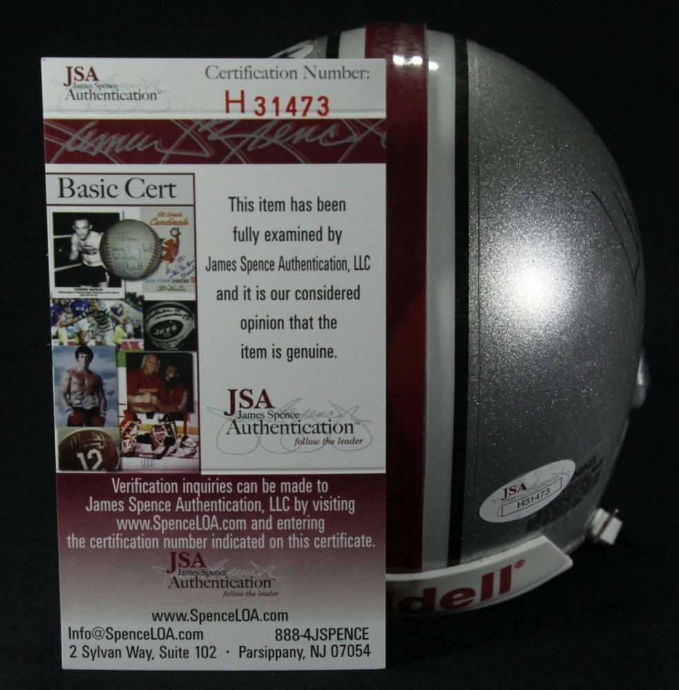 Riddell Replica Mini-Helmet. Hand-signed in black felt-tip pen by Terrelle Pryor (Raiders). Autograph includes an official James Spence Authentication (JSA) hologram and matching COA for authenticity purposes.