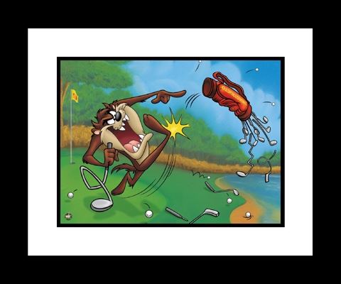 This framed limited edition 16x20 giclee is entitled “Terrible Taz Golfing.†Clearly the funniest adversary to Bugs Bunny is Tasmanian Devil- a voracious, disheveled, whirlwind of teeth, claws, bloodshot eyes and growls, who made his debut in Robert McKimson’s production Devil May Hare in 1954. Amazingly, Taz appeared in only five Looney Tunes shorts before Warner Bros. Animation Studio closed down in 1964, as Taz remains one of the most popular cartoon characters in animation history. Edition Size 500.“Giclée,†as a fine art term, has come to be associated with prints using fade-resistant "archival" inks (including solvent inks) and the inkjet printers that use them.
