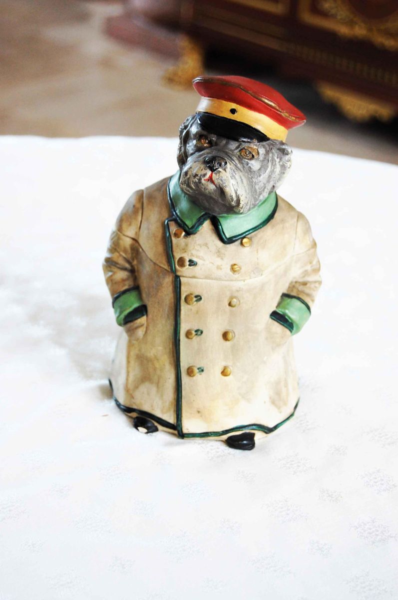 Terrier Dog Tobacco Humidor. Dog dressed in military coat and cap, marked Austria. Minor paint loss and some staining otherwise very good condition. 7 7/8 inches tall.