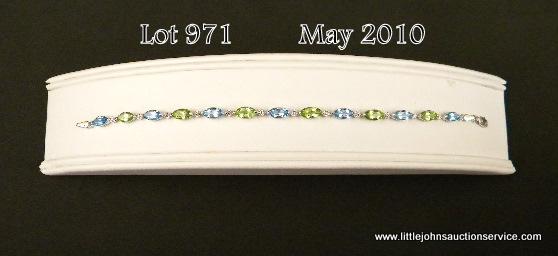 Terrific 10 karat white gold ladies bracelet set  with alternating MQ cut Peridot and blue topaz  weighing over 7.00 carats and side diamond. Retail  $950.00 Estimate $200-$400
