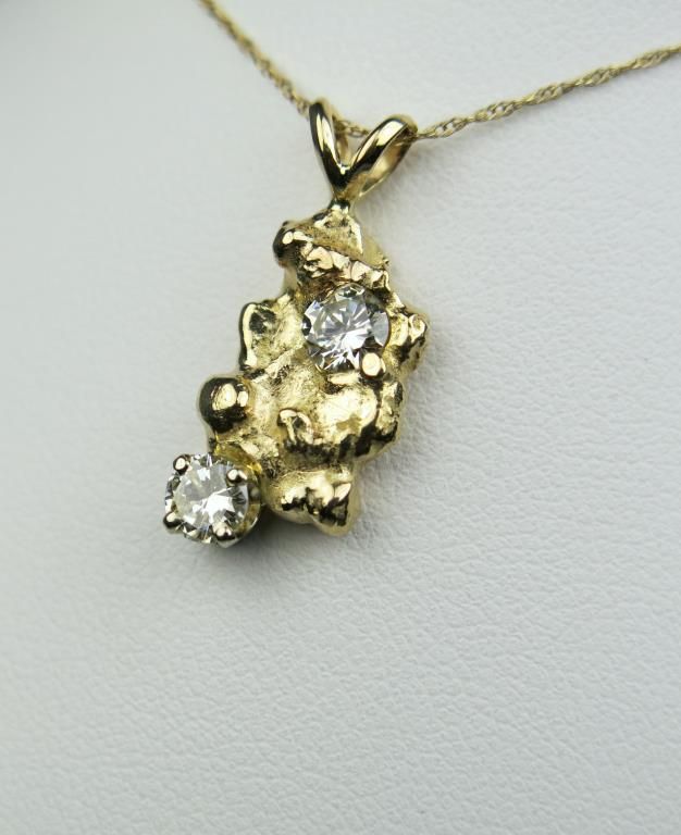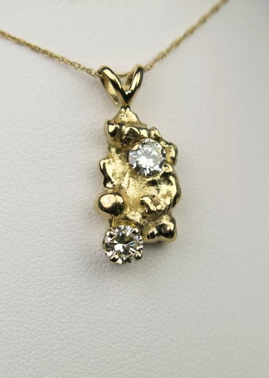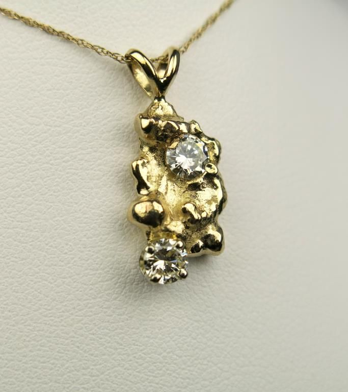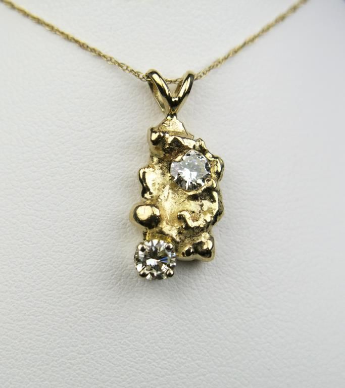 Terrific 14 karat yellow gold ladies custom made nugget necklace set with two round diamonds weighing approx. 0.70 carats of H-I colors and VVS/VS clarity. Retail $2,000-$3,000 Estimate $1,200-$1,800