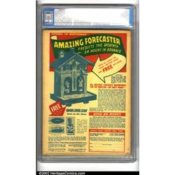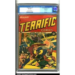 Terrific Comics #1 Crowley pedigree (Continental Magazines, 1944). An incredibly rare book with a dynamic action cover by Don Rico (who also did some great work for Timely) and classic interior art by L. B. Cole. This comic also contains an opium use story, making it not only desirable but controversial as well. CGC VF- 7.5 Cream to off-white pages. Overstreet 2001 FN 6.0 value = $1,000; NM 9.4 value = $3,500.  Important notice: We expect to be auctioning lots at the rate of 200-250 per hour. Sometimes eBay Premier live bid software cannot keep up with that pace, so we strongly recommend that you place a realistic proxy bid now as insurance to avoid disappointment. Also please note that all Heritage/CAA lots purchased through eBay Premier carry a 20% Buyer's Premium.