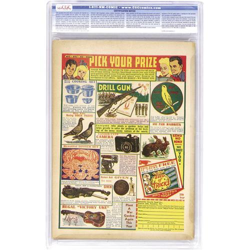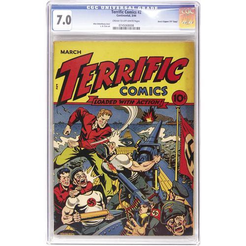 <B>Terrific Comics #2 Davis Crippen ("D" Copy) pedigree (Continental Magazines, 1944) CGC FN/VF 7.0 Cream to off-white pages.</B></I> Alex Schomburg's formula of anti-Nazi punch-outs, used to great effect on the Timely books, worked just as well here, with Kid Terrific and his sidekick Jimmy administering the knuckle sandwiches. The issue has the first appearances of Boomerang and Diana (drawn by L. B. Cole) and also the debut of "Comics" McCormick, the world's biggest comic fan (by Ed Wheelan). We've seen the only copy graded higher to date, which has a bit of a mis-cut, and we'll also note that the Mile High copy of this issue is a "Qualified" copy with little pieces missing; thus, we think this Davis Crippen copy would be an upgrade for any Golden Age collection. Overstreet 2006 FN 6.0 value = $711; VF 8.0 value = $1,481. CGC census 6/06: 1 in 7.0, 1 higher. <I>From the Crippen Collection.</B></I> <BR><BR><B>Important notice:</B> Heritage usually auctions material at the rate of 200-250 lots per hour. On some occasions eBay Live bid software or the Internet may not be able to keep up with the pace of the auction. We recommend placing a realistic absentee bid now as insurance to avoid disappointment. Occasionally the auctioneer may eliminate or reject an eBay Live bid, and the auctioneer may also reopen a lot after the close of the eBay live bidding (usually because we missed an audience bid), and may reject your bid even if it shows you as the winning bidder. By bidding via eBay Live, you agree that Heritage may award the lot to another bidder at its sole discretion under the circumstances described above or any other reasonable circumstances. Since eBay bids are not shown to us until we open the lot on the floor, we treat those bids just like floor bids. In most cases the floor responds before the eBay bid is presented to us, due to Internet lag time, so for consistency we have made it a policy that floor bids are always considered first over tie eBay live bids. Also please note that all Heritage lots purchased through eBay Live carry a 22.5% Buyer's Premium. Please make sure you read the Terms and Conditions before you bid. This lot is being auctioned in conjunction with a live floor auction by Heritage Auction Galleries. All final auction and invoice information will be supplied by Heritage Auction Galleries, and all other information should be considered preliminary. Lot:41001 <BR><BR><B>Winning Notification and Billing:</B> After the FINAL session in this auction is complete, Heritage will send e-mail and snail mail invoices. This process normally takes several days. All final auction and invoice information will be supplied by Heritage Auction Galleries, and all other information should be considered preliminary. <BR><BR>This auction will be conducted on a live auction floor and over the Internet through eBay Live. If you choose to place an absentee bid, please take a moment to <font color='#0000ff'><u><a href='http://pages.ebay.com/liveauctions/help/before/laabsentee.html'>learn how eBay Live absentee bidding works</a></u></font><font color='#000000'>