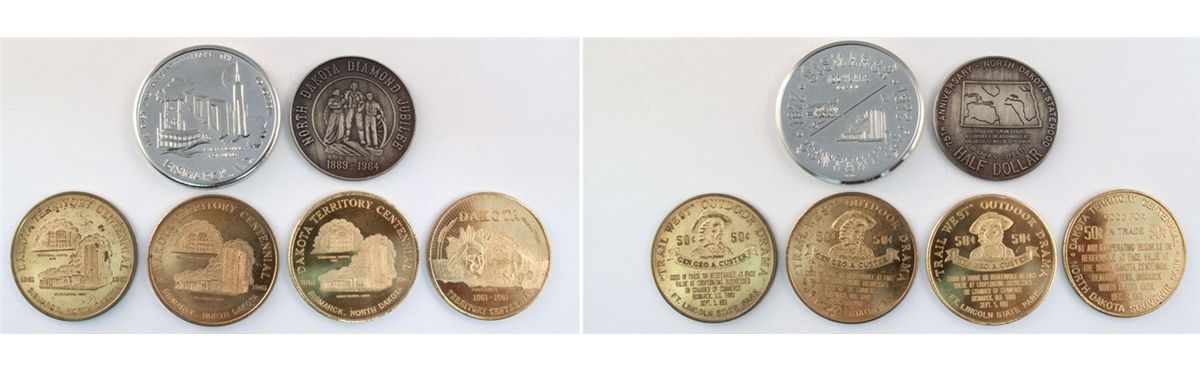 Six medals: 1)1965 North Dakota Diamond Jubilee souvenir half dollar; 2) 1972 Bismark Centennial; 3) 1961 Dakota Territory Centennial; portrait of Four Bears; 4) three 1961 Dakota Territory Centennial pieces with Gen. Geo. A. Custer.