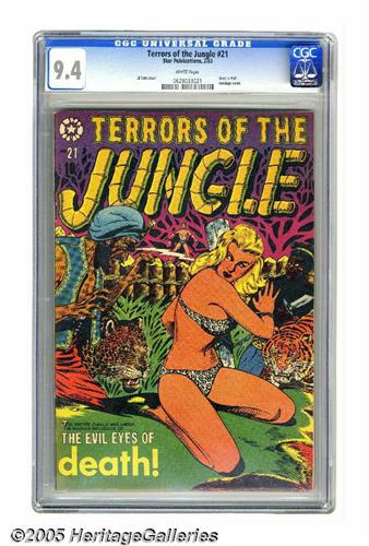 <B>Terrors of the Jungle #21 (Star, 1952) CGC NM 9.4 White pages.</B></I> L. B. Cole drew this issue's bondage cover. The interior of the comic raised a few eyebrows as well, in fact it earned a mention in the book <B>Parade of Pleasure</B></I>. This looks to be by far the best copy of the issue available -- the runner-up in CGC's census is a VF-. Overstreet 2005 NM- 9.2 value = $425. CGC census 5/05: 1 in 9.4, none higher.