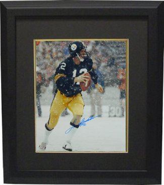 Terry Bradshaw won an unprecedented four Super Bowl titles with Pittsburgh (1974, 1975, 1978 and 1979), becoming the first quarterback to do so, and led the Steelers to eight AFC Central championships. He was inducted into the Pro Football Hall of Fame in 1989, his first year of eligibility. Terry Bradshaw has hand autographed this Pittsburgh Steelers 16x20 Photo in the Snow. Schwartz Sports Hologram and Certificate of Authenticity from Athlon Sports. Custom Black Mat and Premium Black Color Framed as shown.