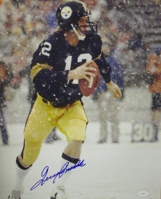 Terry Bradshaw won an unprecedented four Super Bowl titles with Pittsburgh (1974, 1975, 1978 and 1979), becoming the first quarterback to do so, and led the Steelers to eight AFC Central championships. He was inducted into the Pro Football Hall of Fame in 1989, his first year of eligibility. Terry Bradshaw has hand autographed this Pittsburgh Steelers 16x20 Photo in the Snow. James Spence Hologram and Certificate of Authenticity .