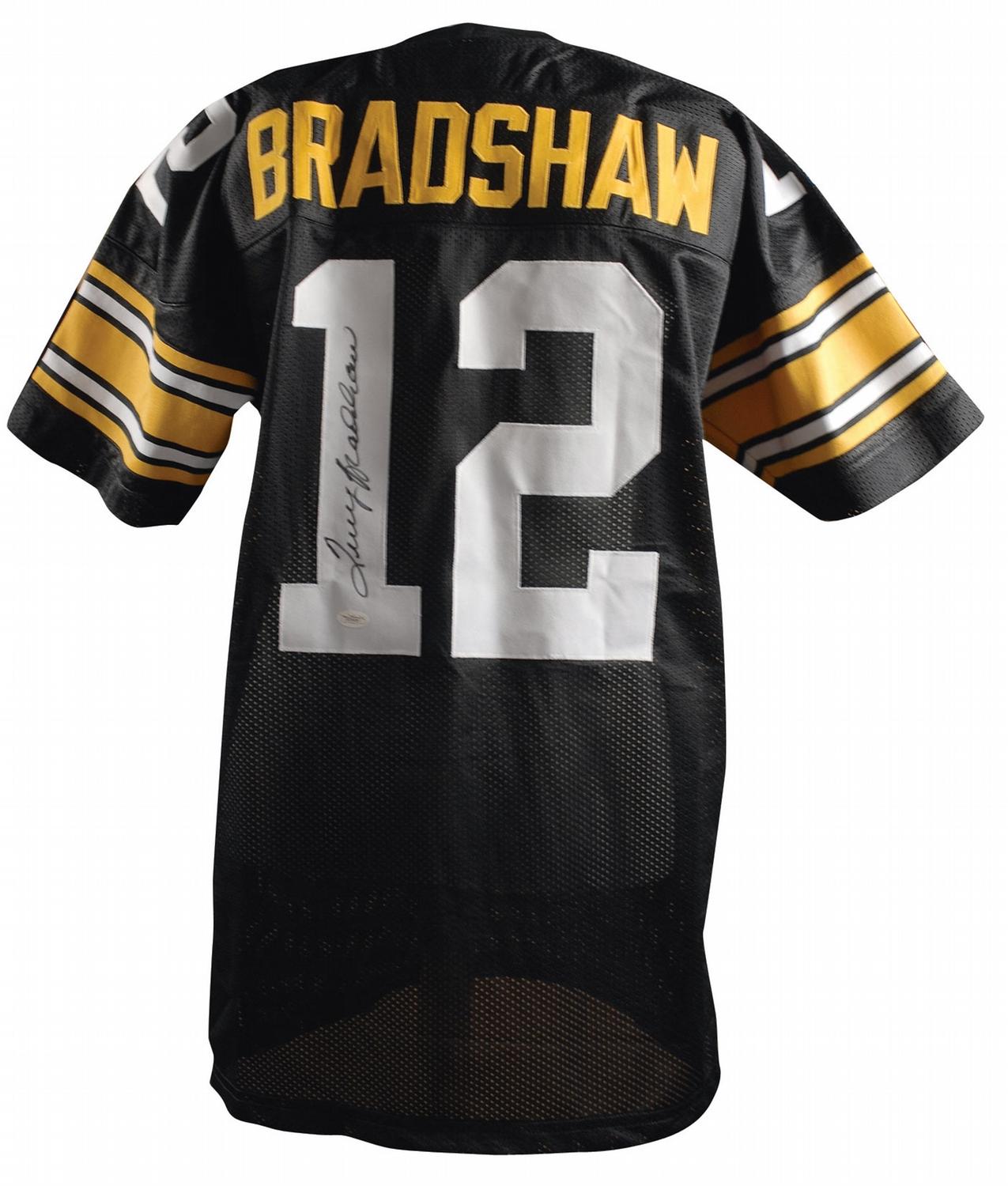 Replica Pittsburgh Steelers football jersey, with sewn on letters and numbers, signed in black felt tip on the number on the back. In very fine condition with a James Spence Authentication label affixed and accompanied by a certificate of authenticity from JSA.