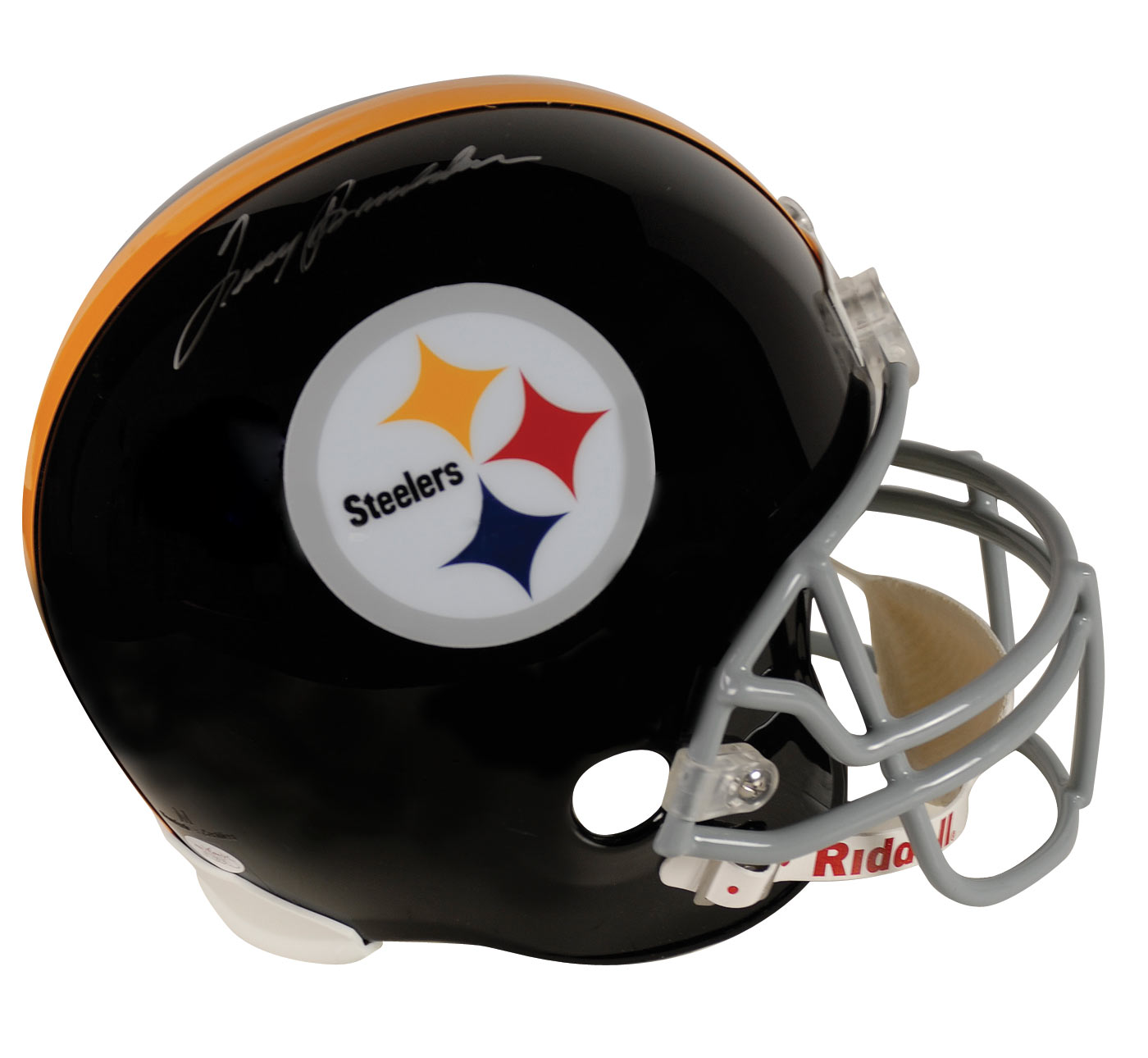 Official Riddell replica Pittsburgh Steelers football helmet signed in silver ink on the side. In fine condition. Accompanied by a certificate of authenticity from James Spence.
