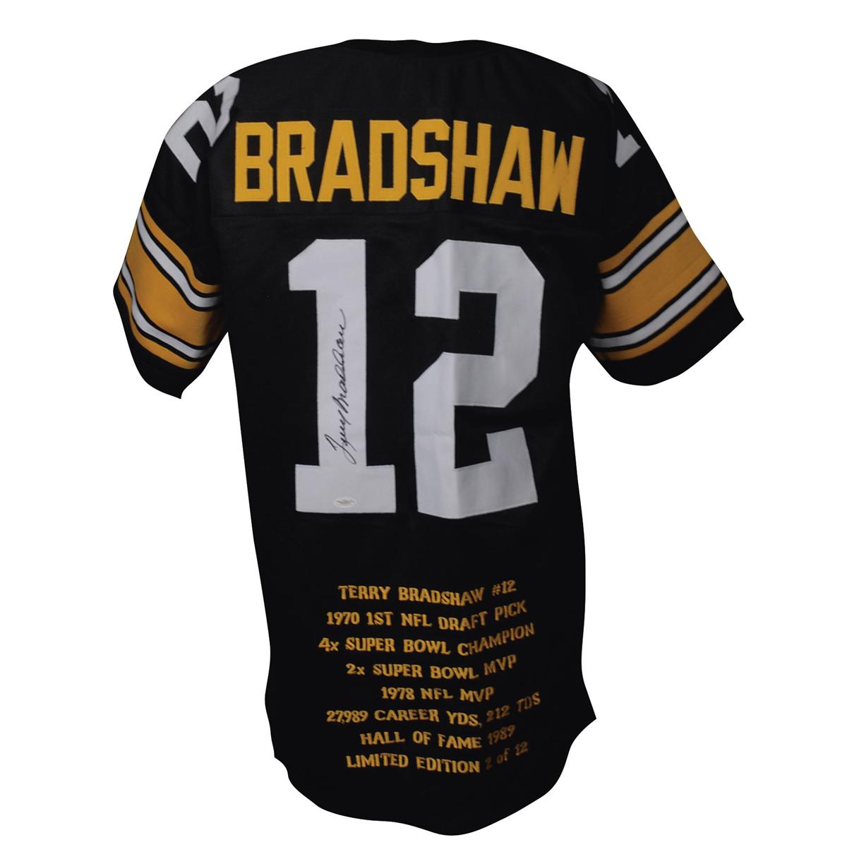 Replica Pittsburgh Steelers football ‘stat’ jersey, with sewn on letters and numbers, signed in black felt tip on the number on the back. In very fine condition with a James Spence Authentication label affixed and accompanied by a certificate of authenticity from James Spence.