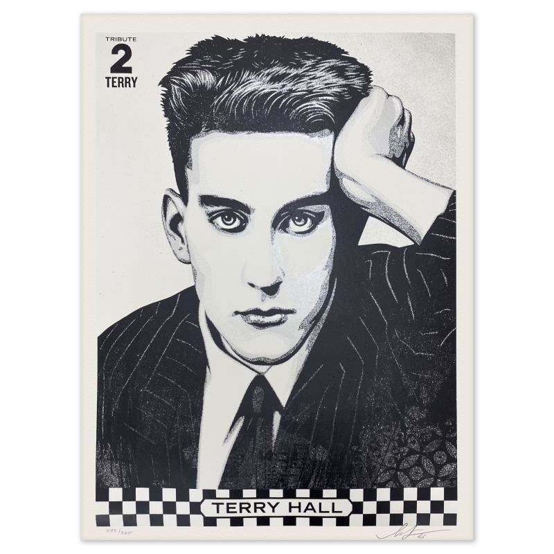 "Terry Hall Tribute" is a limited edition screen print on heavy True White Speckletone paper by Shepard Fairey, numbered 273/325 and hand signed by the artist. This piece is a tribute to the late singer of the Specials, Terry Hall (1959-2022). Includes Letter of Authenticity. Measures approx. 24" x 18" (image).