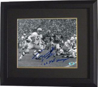 Terry Hanratty attended St. Paul Catholic School and Butler Senior High School in Western Pennsylvania, before attending the University of Notre Dame where he was a three year starter and was twice an All-American, along with being a Heisman Trophy candidate. Hanratty and Jim Seymour formed a formidable passing/receiving duo leading Notre Dame to the national championship in 1966. Hanratty would also be teammates and friends with halfback Rocky Bleier at Notre Dame before the two were teammates in Pittsburgh. He was a member of the the national championship Notre Dame team in 1966. Terry Hanratty has hand signed this Notre Dame Fighting Irish B&W 8x10 Photo vs Michigan State with 66 National Champions inscription. MAB Hologram and Certificate of Authenticity from Athlon Sports. Custom White Mat and Premium Black Frame as shown.