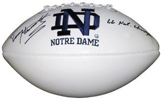 Terry Hanratty attended St. Paul Catholic School and Butler Senior High School in Western Pennsylvania, before attending the University of Notre Dame where he was a three year starter and was twice an All-American, along with being a Heisman Trophy candidate. Hanratty and Jim Seymour formed a formidable passing/receiving duo leading Notre Dame to the national championship in 1966. Hanratty would also be teammates and friends with halfback Rocky Bleier at Notre Dame before the two were teammates in Pittsburgh. He was a member of the the national championship Notre Dame team in 1966. Terry Hanratty has hand signed this Notre Dame Logo Football and has added the inscription, "66 Nat Champions." MAB Hologram and Certificate of Authenticity from Athlon Sports.