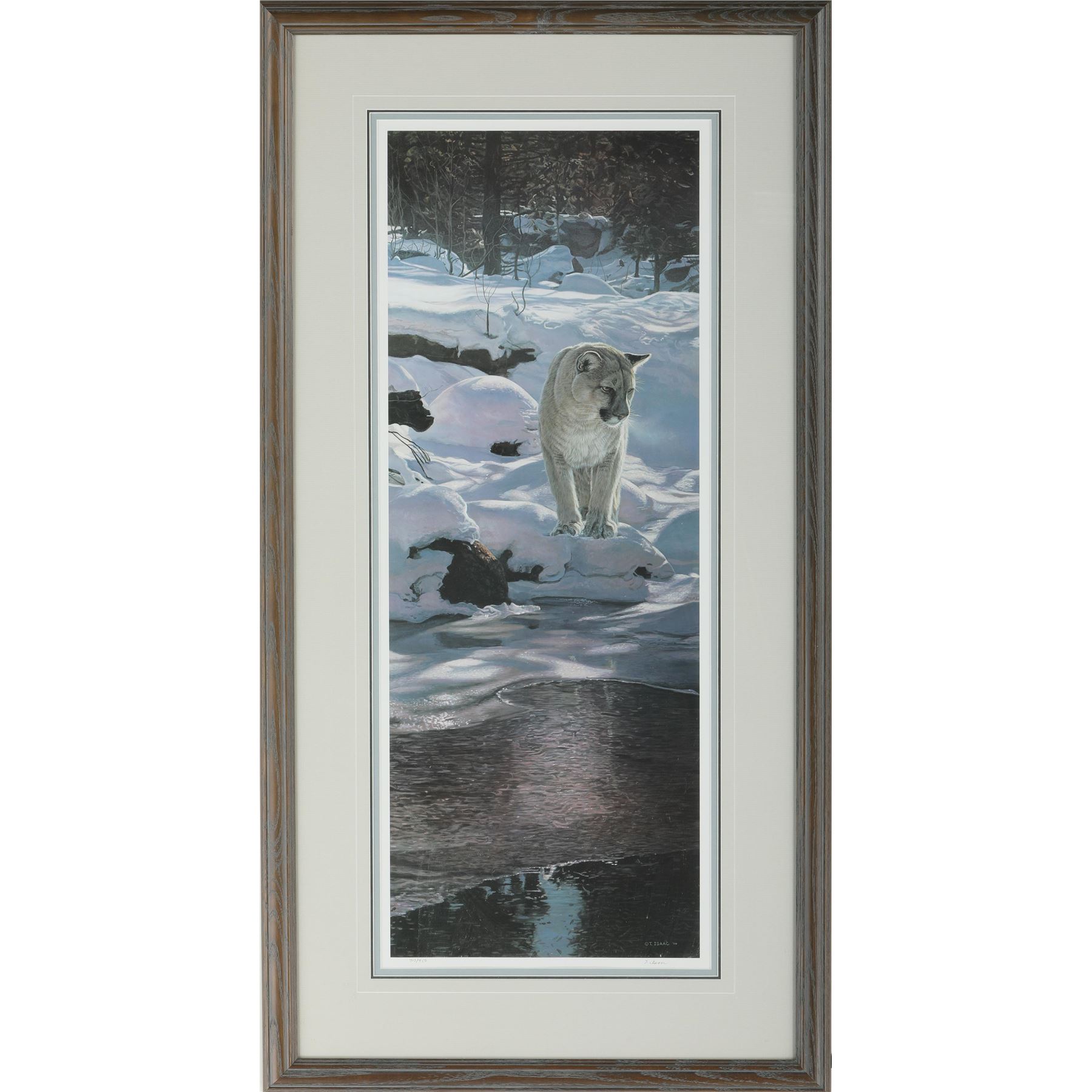 Terry Isaac's "Snow Shadows - Cougar" limited edition print, signed and numbered 713/950. This piece has been professionally triple matted, and custom framed under glass. Image- 31" x 11 1/2". Frame- 41" x 21 1/4".