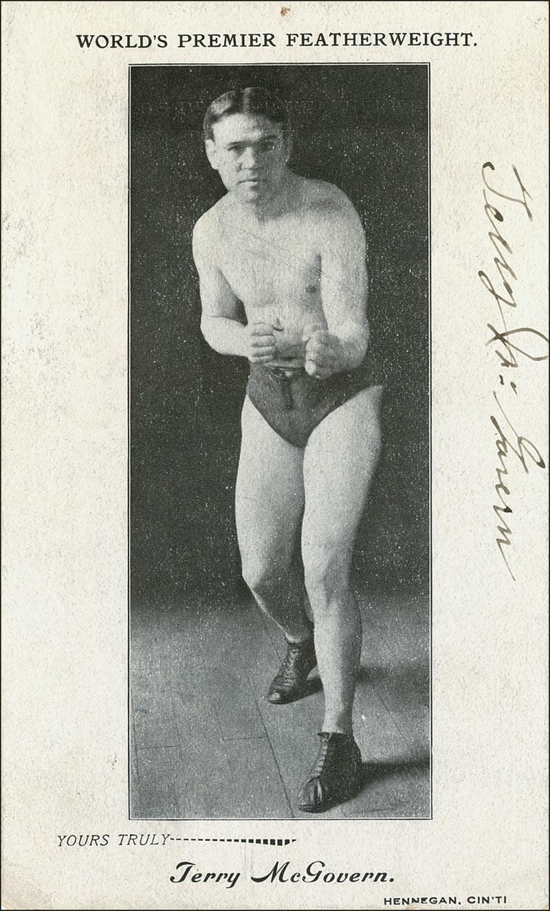 Boxer (1880-1918) who held the world bantamweight and featherweight titles, and spent much of his later life in mental institutions. Very rare vintage 3.25 x 5.5 lightweight photo of McGovern in his prime touting him as the “World’s Premier Featherweight,” signed vertically in fountain pen. In fine condition, with some mild handling wear and a ding to bottom edge. Pre-certified Steve Grad/PSA/DNA and RRAuction COA.