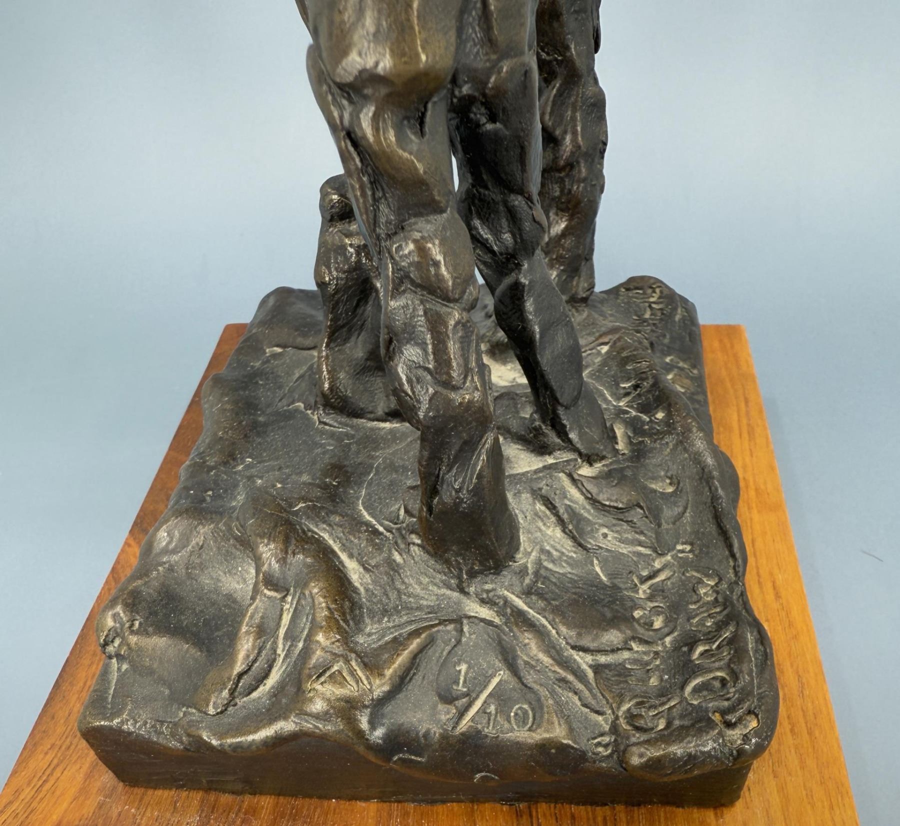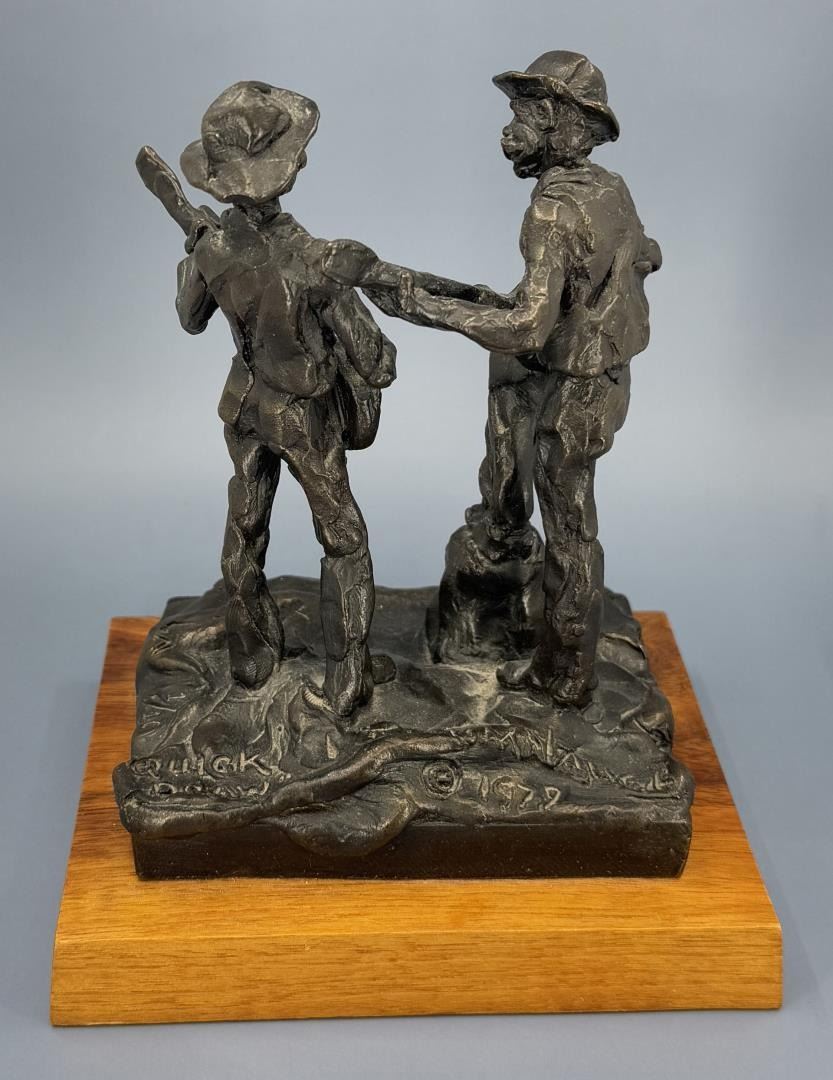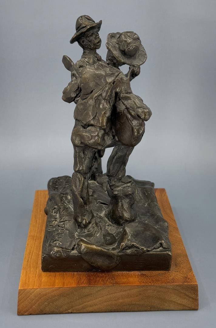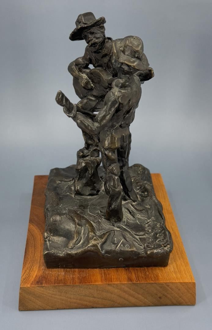 7" by 5 5/8" by 4 3/4". Terry Mimnaugh (Born 1955) is active/lives in Montana. Terry Mimnaugh is known for Figure, genre, landscape, heroic bronze. Residing in Montana, Terry Mimnaugh is known for her oils, watercolors, pastels, and heroic bronzes. Because of herskill at capturing the true essence of children in their element, she's highly sought after for commissioned work of children and religious icons. Ms. Mimnaugh participates annually in the Charles Russell Auction in Great Falls and she's won multiple awards including the Richard Schmid merit award, the NWR Award, and a Montana Institute of the Arts Award.