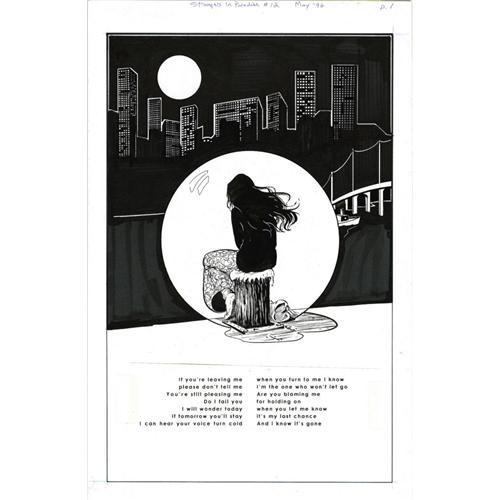 <B>Terry Moore - Strangers in Paradise #12 page 1 Original Art (Abstract Studio, 1996).</B></I> Terry Moore's award-winning independent series <B>Strangers in Paradise</B></I> is nothing if not emotional, and this pensive splash page features leading lady Francine in a moment of reflection. Moore's expressive linework is always a joy, and this simple, evocative composition has a quiet power all its own. The image area measures 9.65" x 15" and the artwork is in Excellent condition, with the type at the bottom being a taped-in print-out.