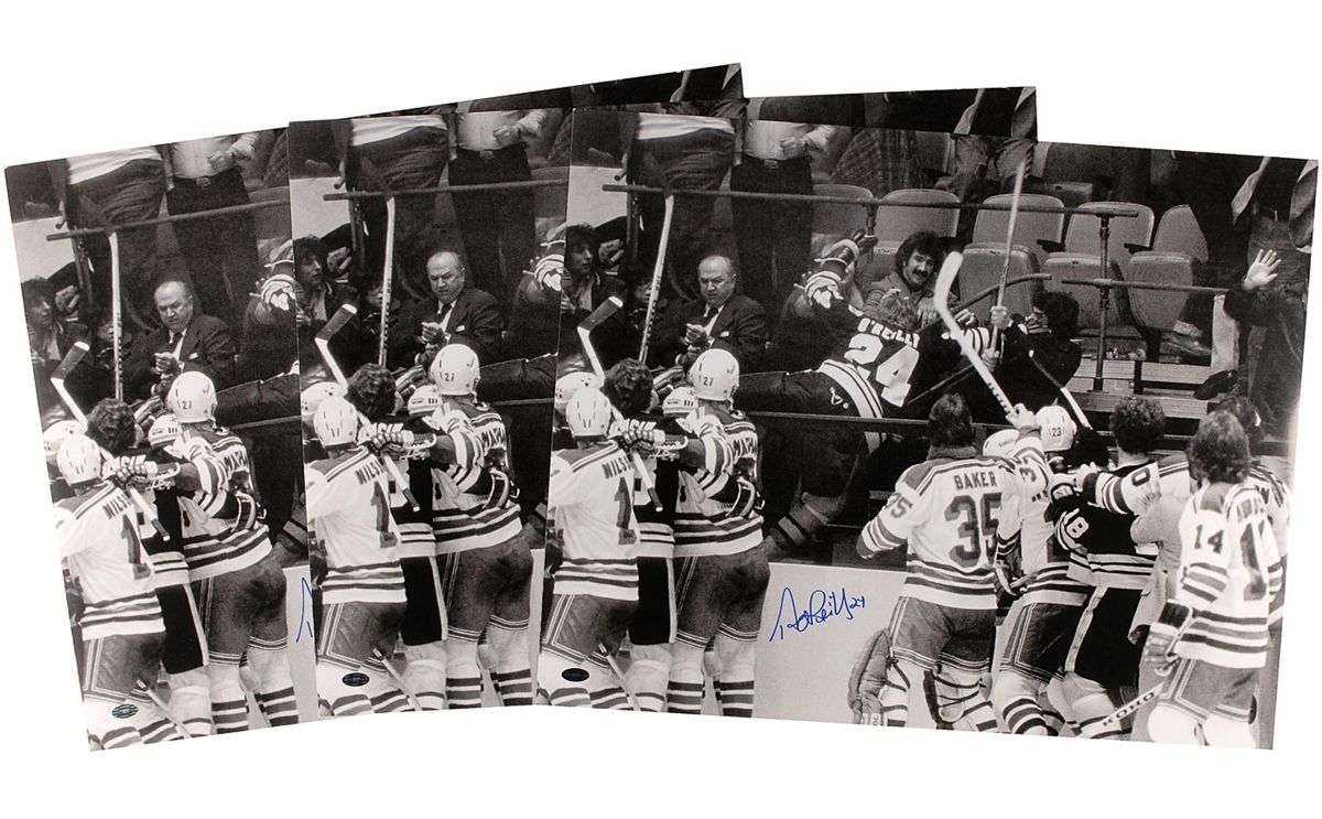 Three identical glossy 20 x 16 photos of O’Reilly storming into the stands after Rangers fans in Madison Square Garden after a Bruins–Rangers game in 1979, each signed in blue felt tip. In fine condition.