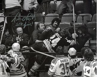 Terry O'Reilly was picked by the Boston Bruins in the 1st round as the 14th pick overall in the 1971 NHL Amateur Draft. O'Reilly spent his entire career in Boston, serving as the captain of the Bruins during the 1983–84 and 1984–85 seasons before his retirement. In the infamous December 23, 1979 incident at Madison Square Garden, during a post-game scrum, a New York Rangers fan rolled up a program tightly and smacked Stan Jonathan in the face drawing blood, and then stole his stick and wielded it like a weapon. O'Reilly scaled the glass boards and charged into the stands. His teammates followed when other fans tried to intervene. O'Reilly was suspended eight games for his part in the brawl. Terry O'Reilly has hand signed this Boston Bruins B&W 8X10 Photo going into the crowd with "25k fine!" inscription. Certificate of Authenticity from Athlon Sports Collectibles.