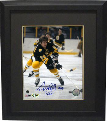 Terry O'Reilly was picked by the Boston Bruins in the 1st round as the 14th pick overall in the 1971 NHL Amateur Draft. O'Reilly spent his entire career in Boston, serving as the captain of the Bruins during the 1983–84 and 1984–85 seasons before his retirement. In the infamous December 23, 1979 incident at Madison Square Garden, during a post-game scrum, a New York Rangers fan rolled up a program tightly and smacked Stan Jonathan in the face drawing blood, and then stole his stick and wielded it like a weapon. O'Reilly scaled the glass boards and charged into the stands. His teammates followed when other fans tried to intervene. O'Reilly was suspended eight games for his part in the brawl. Terry O'Reilly has hand signed this Boston Bruins Color 8X10 Photo with "Taz" inscription. MAB Hologram and Certificate of Authenticity from Athlon Sports. Custom Black Mat and Premium Black Color Framed as shown.