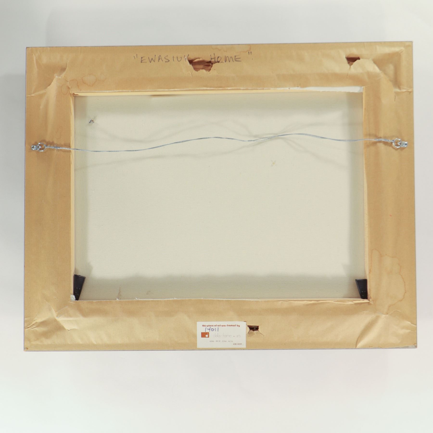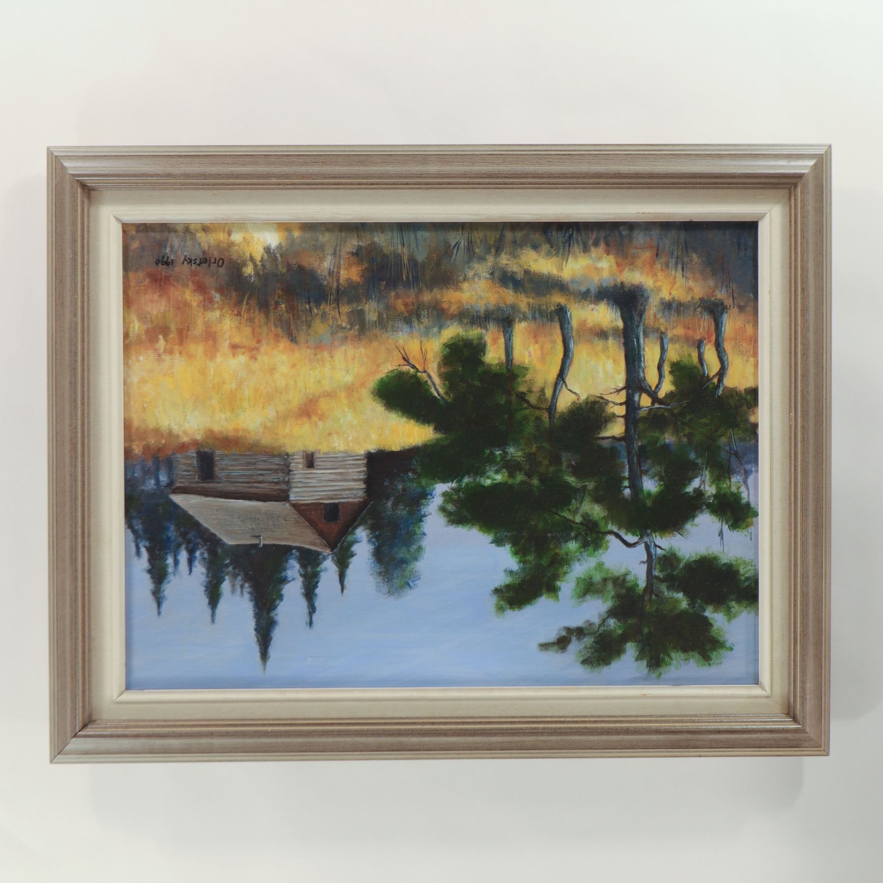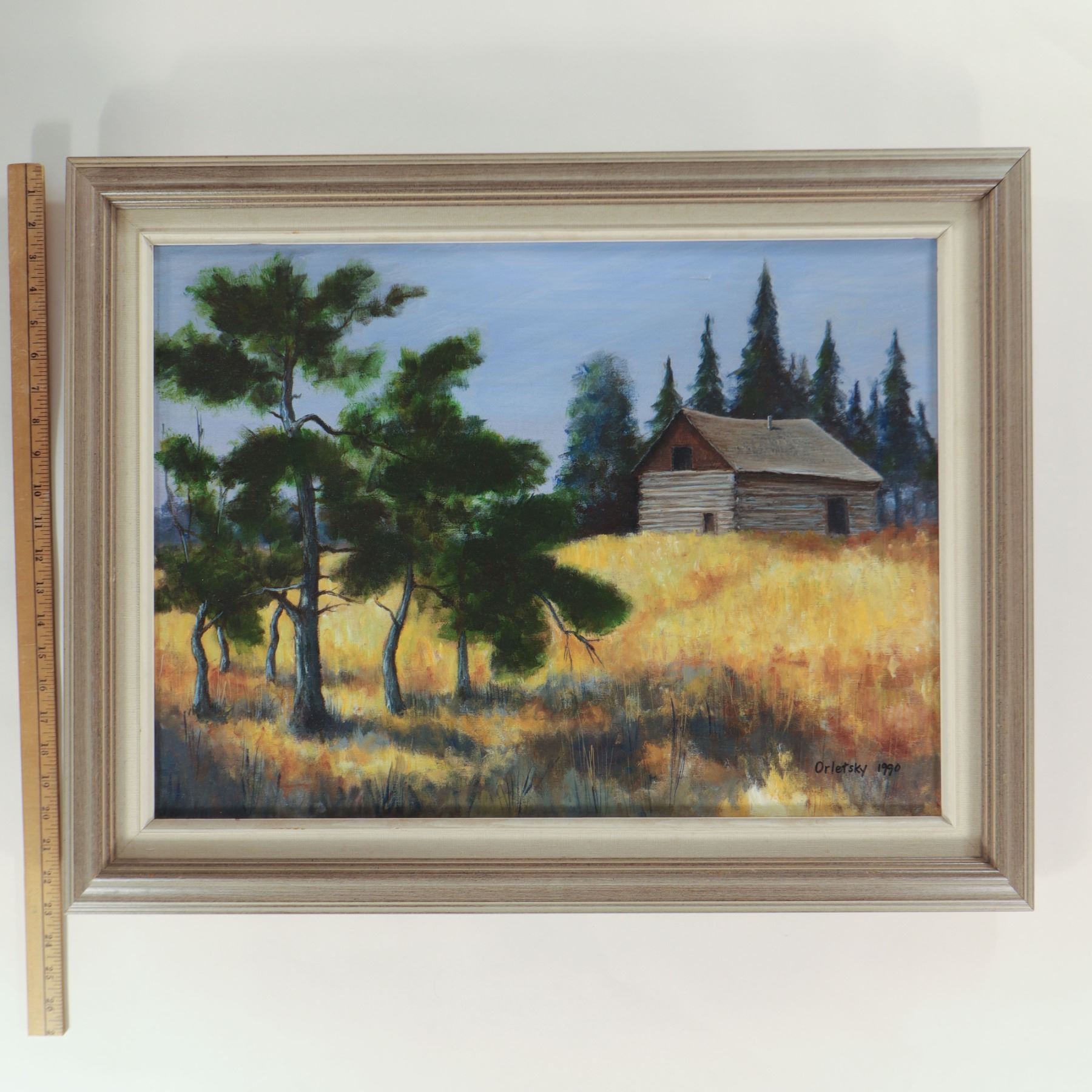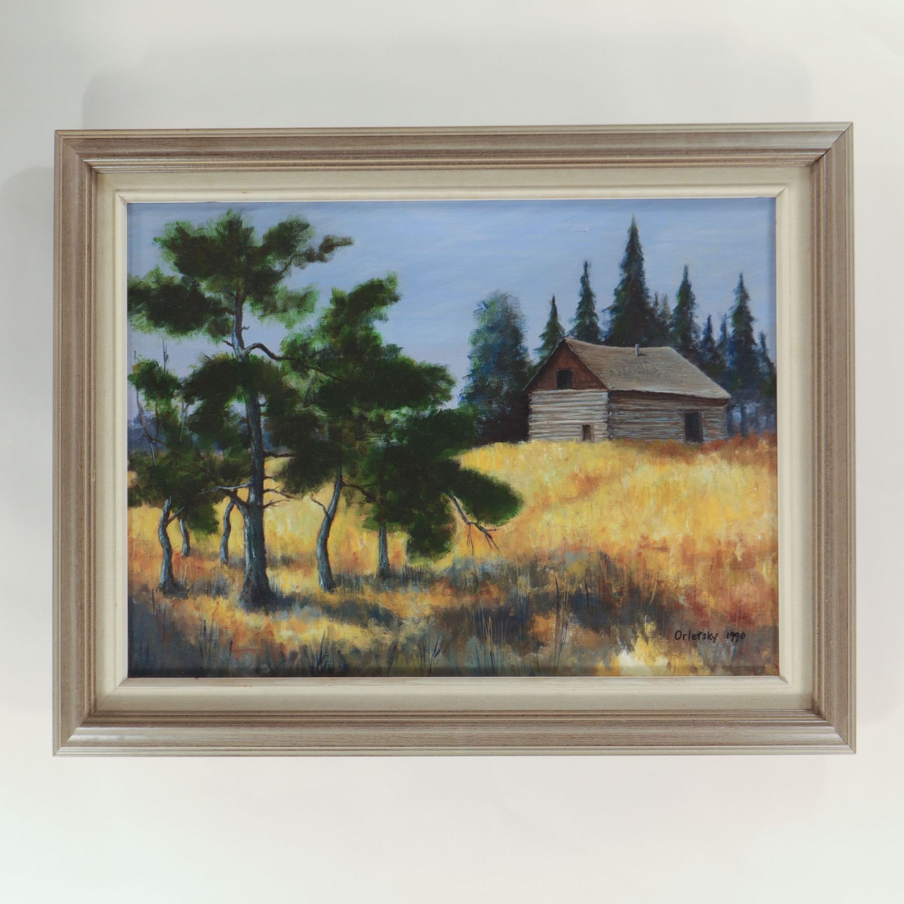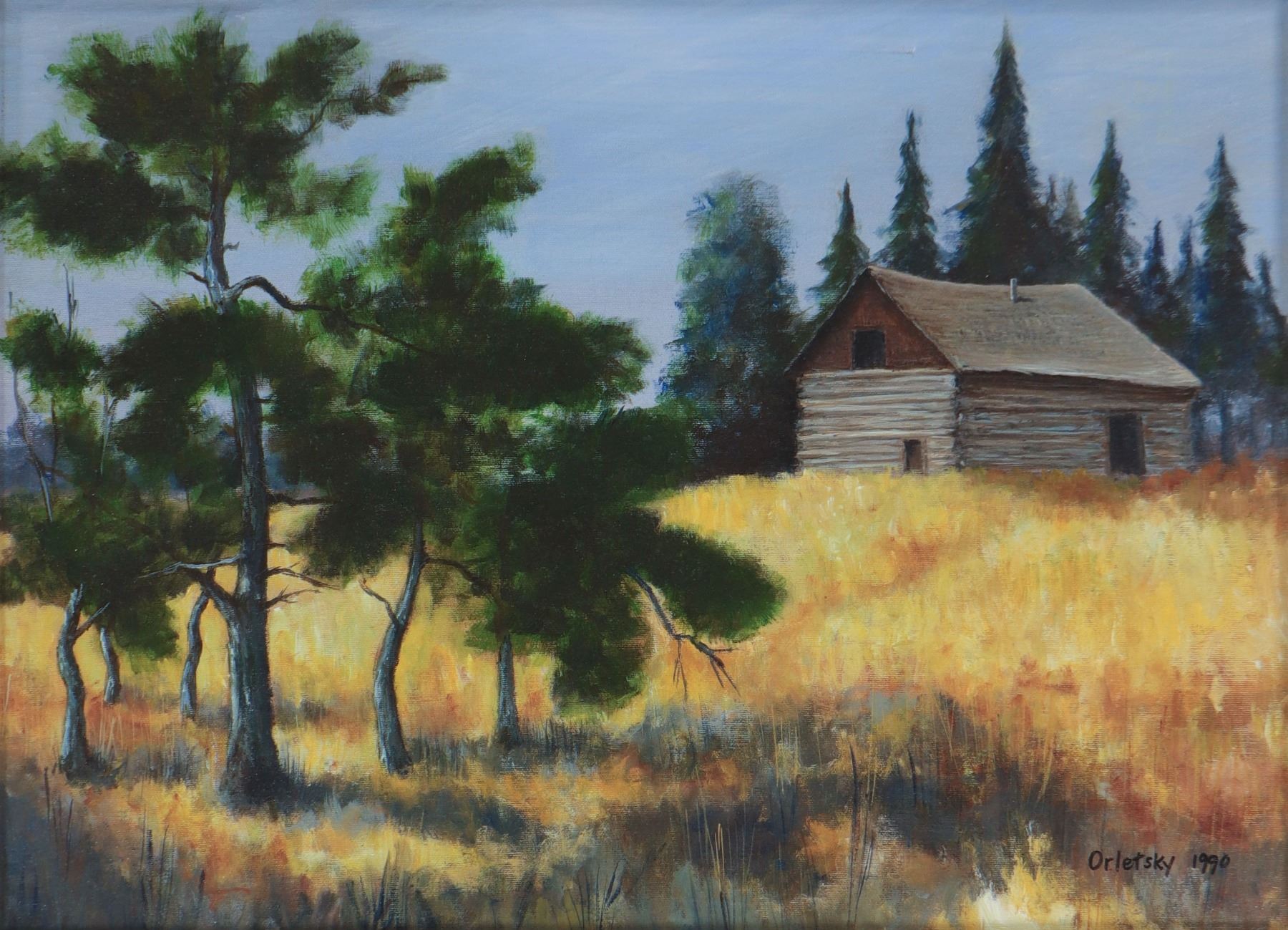 Signed “Orletsky 1990” lower right, this landscape painting depicts a weathered prairie cabin set beyond sunlit grasses, with a stand of wind-shaped pines in the foreground and dark evergreens rising behind. The composition has a distinctly Western Canadian feel, balancing warm ochres and golds against cooler blue-grey shadows and sky. The subject is handled in a soft, atmospheric manner, with the homestead partly absorbed into the surrounding land, giving the picture a reflective, nostalgic quality. Framed size 29 x 23 in.; artwork size 24 x 18 in.
