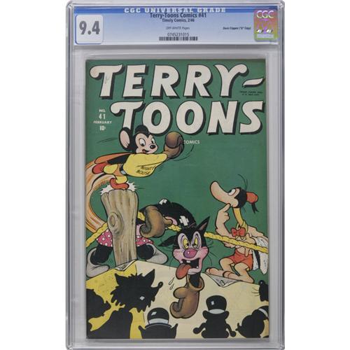 <B>Terry-Toons Comics #41 Davis Crippen ("D" Copy) pedigree (Timely, 1946) CGC NM 9.4 Off-white pages.</B></I> This is one of the earliest comic book appearances of Mighty Mouse, who first appeared in #38 of this series. The runner-up in CGC's census is far behind at VG+ 4.5. Overstreet 2006 NM- 9.2 value = $220. CGC census 9/06: 1 in 9.4, none higher. <I>From the Crippen Collection</B></I>.<BR><BR><b>Shipping:</b> Slabbed Comic (<a target="_blank" href="http://www.heritageauctions.com/common/shipping.php">view shipping information</a>)