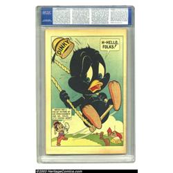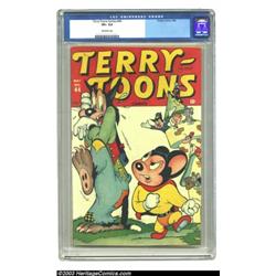 Terry-Toons Comics #44 (Timely, 1946) CGC VF+ 8.5 Off-white pages. Here he comes to save Animaltown -- it's Mighty Mouse in his sixth Terry-Toons appearance. He's ready to knock some sense into the Wolf, while Gandy Goose, Sourpuss, and others cheer him on. Hooray! This is a pretty copy, flat and tight, with great color. There's a few tiny stress lines around the single staple, and some slight rounding of the spine corners, but this copy still retains a fresh, clean look. Overstreet 2003 VF 8.0 value = $101; VF/NM 9.0 value = $133. Important notice: Heritage usually auctions material at the rate of 200-250 lots per hour. On some occasions eBay Live bid software or the Internet may not be able to keep up with the pace of the auction. We recommend placing a realistic absentee bid now as insurance to avoid disappointment. Occasionally the auctioneer may eliminate or reject an eBay Live bid, and the auctioneer may also reopen a lot after the close of the eBay live bidding (usually because we missed an audience bid), and may reject your bid even if it shows you as the winning bidder. By bidding via eBay Live, you agree that Heritage may award the lot to another bidder at its sole discretion under the circumstances described above or any other reasonable circumstances. Also please note that all Heritage lots purchased through eBay Live carry a 20% Buyer's Premium. Please make sure you read the Terms and Conditions before you bid.