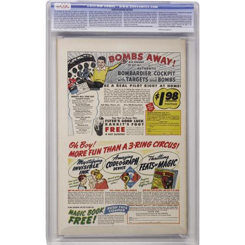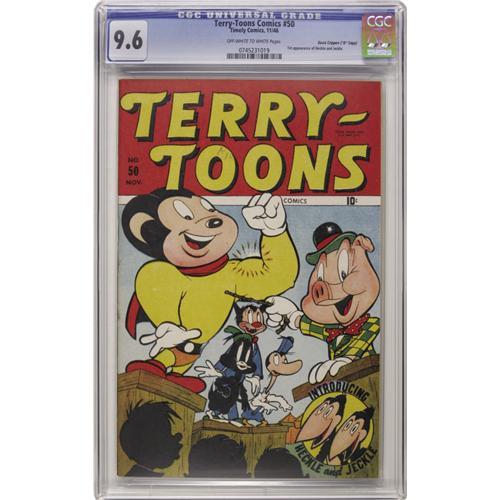 <B>Terry-Toons Comics #50 Davis Crippen ("D" Copy) pedigree (Timely, 1946) CGC NM+ 9.6 Off-white to white pages.</B></I> Heckle and Jeckle made their first comic book appearance right here, in a <I>Timely</B></I> book! This issue was close on the heels of the twins' cartoon debut. They went on to have a long comic book career at St. John, Dell/Gold Key, and elsewhere. The Crippen copy of Mighty Mouse's first appearance in <B>Terry-Toons</B></I> #38 sold for seven times Guide in a previous auction, and we hasten to add that it had a lower grade than this specimen! We expect healthy interest in this copy, too, especially since it's the only copy graded above 9.2. Overstreet 2006 NM- 9.2 value = $500. CGC census 9/06: 1 in 9.6, none higher. <I>From the Crippen Collection</B></I>.<BR><BR><b>Shipping:</b> Slabbed Comic (<a target="_blank" href="http://www.heritageauctions.com/common/shipping.php">view shipping information</a>)