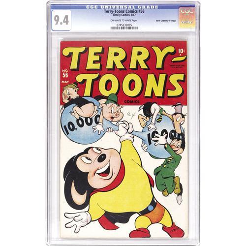 <B>Terry-Toons Comics #56 Davis Crippen ("D" Copy) pedigree (Timely, 1947) CGC NM 9.4 Off-white to white pages.</B></I> Get a load of this one, Timely fans! It's the only copy CGC has certified as of this writing, and the white front and back covers look very nice indeed. Overstreet 2006 NM- 9.2 value = $135. CGC census 6/06: 1 in 9.4, none higher. <I>From the Crippen Collection.</B></I> <BR><BR><B>Important notice:</B> Heritage usually auctions material at the rate of 200-250 lots per hour. On some occasions eBay Live bid software or the Internet may not be able to keep up with the pace of the auction. We recommend placing a realistic absentee bid now as insurance to avoid disappointment. Occasionally the auctioneer may eliminate or reject an eBay Live bid, and the auctioneer may also reopen a lot after the close of the eBay live bidding (usually because we missed an audience bid), and may reject your bid even if it shows you as the winning bidder. By bidding via eBay Live, you agree that Heritage may award the lot to another bidder at its sole discretion under the circumstances described above or any other reasonable circumstances. Since eBay bids are not shown to us until we open the lot on the floor, we treat those bids just like floor bids. In most cases the floor responds before the eBay bid is presented to us, due to Internet lag time, so for consistency we have made it a policy that floor bids are always considered first over tie eBay live bids. Also please note that all Heritage lots purchased through eBay Live carry a 22.5% Buyer's Premium. Please make sure you read the Terms and Conditions before you bid. This lot is being auctioned in conjunction with a live floor auction by Heritage Auction Galleries. All final auction and invoice information will be supplied by Heritage Auction Galleries, and all other information should be considered preliminary. Lot:41001 <BR><BR><B>Winning Notification and Billing:</B> After the FINAL session in this auction is complete, Heritage will send e-mail and snail mail invoices. This process normally takes several days. All final auction and invoice information will be supplied by Heritage Auction Galleries, and all other information should be considered preliminary. <BR><BR>This auction will be conducted on a live auction floor and over the Internet through eBay Live. If you choose to place an absentee bid, please take a moment to <font color='#0000ff'><u><a href='http://pages.ebay.com/liveauctions/help/before/laabsentee.html'>learn how eBay Live absentee bidding works</a></u></font><font color='#000000'>