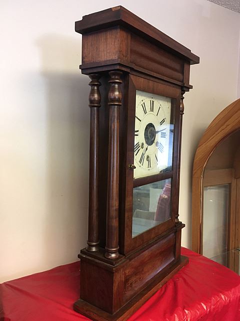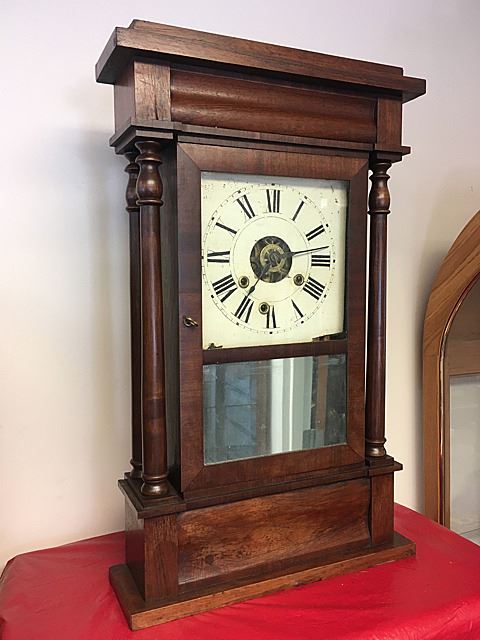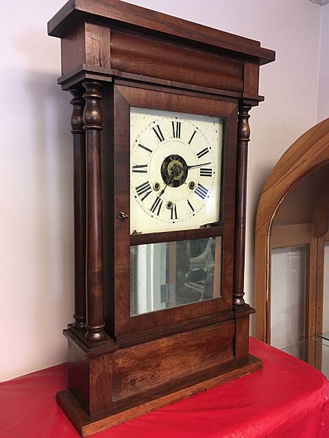 Terry and Andrews, New York double column empire shelf clock, nice original dial, beautiful finish, double turned columns, mirrored bottom tablet, measures approx. 26" tall x 16" wide x 4 1/2" deep.