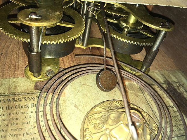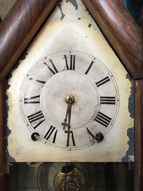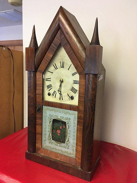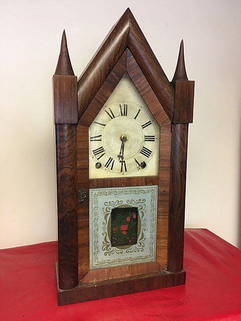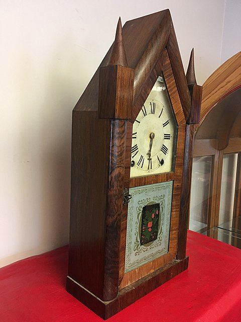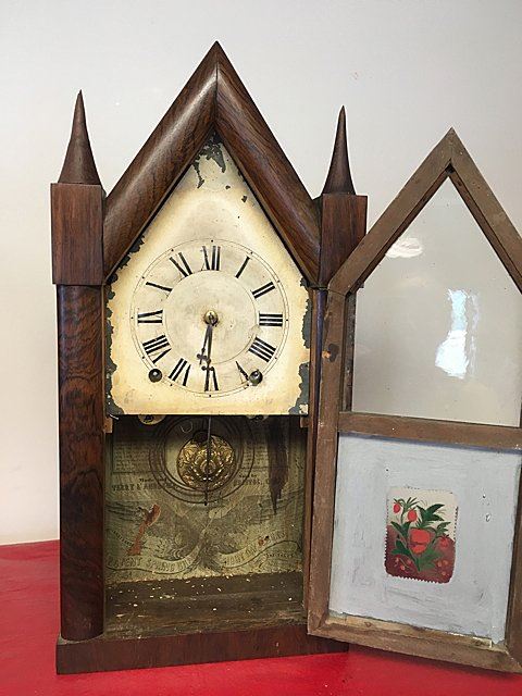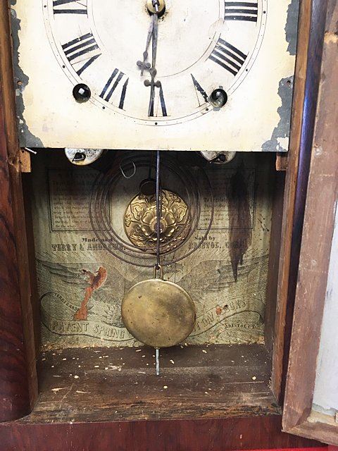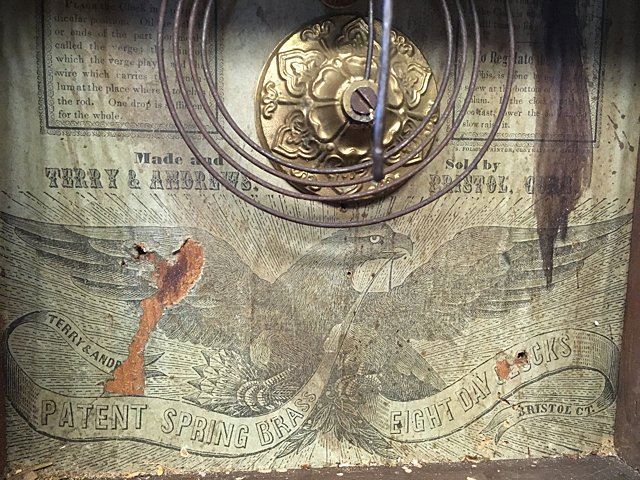 Terry & Andrews Steeple Clock, Bristol, Connecticut, eight-day, time and strike brass spring-powered movement, sharp gothic or steeple clock, original dial, reverse painted glass, label, "Made and Sold by Terry & Andrews, Bristol, CT" with eagle and banner "Terry & Andrew Patent Spring Brass Eight Day Clocks Bristol, CT", measures approx. 20" tall x 10" wide by 4 1/4" deep.