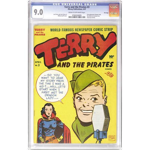 <B>Terry and the Pirates #3 (Harvey, 1947) CGC VF/NM 9.0 Cream to off-white pages.</B></I> Milton Caniff's Dragon Lady made her first comic book appearance here. There's also a Boy Explorers story by Simon and Kirby. Overstreet 2006 VF/NM 9.0 value = $361; NM- 9.2 value = $485. CGC census 6/06: 1 in 9.0, 2 higher. <BR><BR><B>Important notice:</B> Heritage usually auctions material at the rate of 200-250 lots per hour. On some occasions eBay Live bid software or the Internet may not be able to keep up with the pace of the auction. We recommend placing a realistic absentee bid now as insurance to avoid disappointment. Occasionally the auctioneer may eliminate or reject an eBay Live bid, and the auctioneer may also reopen a lot after the close of the eBay live bidding (usually because we missed an audience bid), and may reject your bid even if it shows you as the winning bidder. By bidding via eBay Live, you agree that Heritage may award the lot to another bidder at its sole discretion under the circumstances described above or any other reasonable circumstances. Since eBay bids are not shown to us until we open the lot on the floor, we treat those bids just like floor bids. In most cases the floor responds before the eBay bid is presented to us, due to Internet lag time, so for consistency we have made it a policy that floor bids are always considered first over tie eBay live bids. Also please note that all Heritage lots purchased through eBay Live carry a 22.5% Buyer's Premium. Please make sure you read the Terms and Conditions before you bid. This lot is being auctioned in conjunction with a live floor auction by Heritage Auction Galleries. All final auction and invoice information will be supplied by Heritage Auction Galleries, and all other information should be considered preliminary. Lot:41001 <BR><BR><B>Winning Notification and Billing:</B> After the FINAL session in this auction is complete, Heritage will send e-mail and snail mail invoices. This process normally takes several days. All final auction and invoice information will be supplied by Heritage Auction Galleries, and all other information should be considered preliminary. <BR><BR>This auction will be conducted on a live auction floor and over the Internet through eBay Live. If you choose to place an absentee bid, please take a moment to <font color='#0000ff'><u><a href='http://pages.ebay.com/liveauctions/help/before/laabsentee.html'>learn how eBay Live absentee bidding works</a></u></font><font color='#000000'>