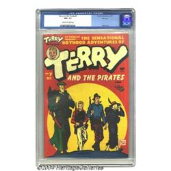 Terry and the Pirates #7 File Copy (Harvey, 1947) CGC NM- 9.2 Cream to off-white pages. Terry, Pat, and the gang go marching off to find adventure on the Milton Caniff-illustrated cover for this issue. And what an issue, too -- great File Copy condition, Bob Powell art, all this, and Terry, too! Overstreet 2003 NM 9.4 value = $110. Important notice: Heritage usually auctions material at the rate of 200-250 lots per hour. On some occasions eBay Live bid software or the Internet may not be able to keep up with the pace of the auction. We recommend placing a realistic absentee bid now as insurance to avoid disappointment. Occasionally the auctioneer may eliminate or reject an eBay Live bid, and the auctioneer may also reopen a lot after the close of the eBay live bidding (usually because we missed an audience bid), and may reject your bid even if it shows you as the winning bidder. By bidding via eBay Live, you agree that Heritage may award the lot to another bidder at its sole discretion under the circumstances described above or any other reasonable circumstances. Since eBay bids are not shown to us until we open the lot on the floor, we treat those bids just like floor bids. In most cases the floor responds before the eBay bid is presented to us, due to Internet lag time, so for consistency we have made it a policy that floor bids are always considered first over tie eBay live bids. Also please note that all Heritage lots purchased through eBay Live carry a 20% Buyer's Premium. Please make sure you read the Terms and Conditions before you bid.