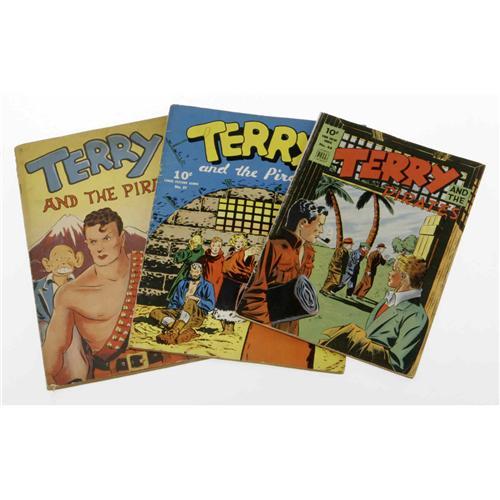 <B>Terry and the Pirates Box Lot (Various Publishers, 1938-55) Condition: Average GD.</B></I> A VG copy of <B>Large Feature Comic</B></I> #27 is the highlight of this box lot, which also includes #2 (FR), #6 (1938; GD); #6 (1942; FR); 1980s reprints of #2, 6, and 27; <B>Four Color</B></I> (Series 1) #9; <B>Four Color</B></I> (Series 2) #44 (VG/FN) and #101; <B>Terry and the Pirates</B></I>(Harvey series) #3-26 (the full run of the series; grades ranging from FR to FN/VF) plus a few coverless issues of the Harvey series; issues #26-28 of the Charlton series (the full run, which unaccountably started with #26 instead of #27); a copy of the Buster Brown giveaway; three copies of the Popped Wheat giveaway; a copy of a Book's Shoe Store giveaway (not listed in Overstreet; 48 pages, 5 ¾ x 3 ½; VG); five copies of various Canada Dry giveaways; a coloring book numbered 398; Big Little Books 1156 (two copies), 1412 (two copies), 1420, 1436, 1446, 1492, 1499, 4073 (Big Big Book) and #nn ("The Mystery Ship," a Fast-Action Story, PR); plus a Milton Caniff bonus in <B>Steve Canyon</B></I> #2 and two copies of #3. Approximate Overstreet value for group= $1,150.