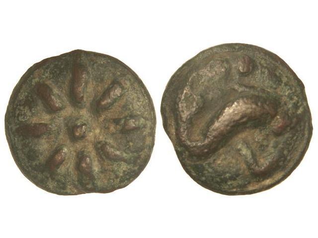 Teruncius. 220 a.C. ANÓNIMO. APULIA. LUCERIA. Anv.: Estrella de ocho puntas. Rev.: Delfín a derecha, encima ¿3 puntos?, debajo ¶y punto. 23,80 grs. Pátina oscura. T&V-283. MBC+.
