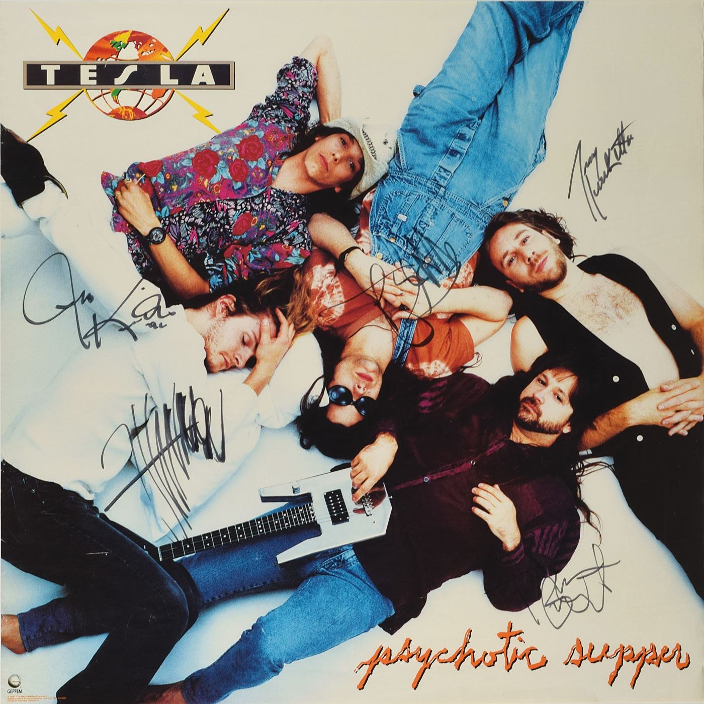 Geffen Records color 23.75 x 23.75 poster promoting Tesla's 1991 album Psychotic Supper, signed in black felt tip by Jeff Keith, Tommy Skeoch, Frank Hannon, Brian Wheat, and Troy Luccketta. Rolled and in very good to fine condition, with scattered light creasing and a repaired tear to the bottom edge.