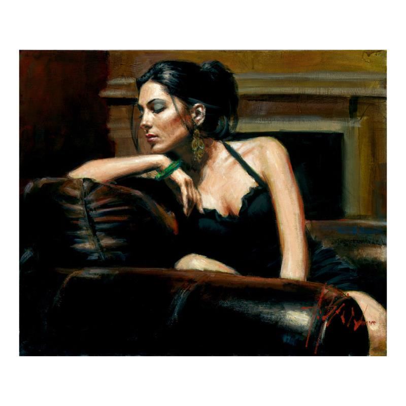 "Tess III with Fire Place" is a hand embellished limited edition giclee on stretched canvas by Fabian Perez. The piece is numbered and hand signed by the artist and comes with a Certificate of Authenticity. Measures approx. 15" x 18" (image). Please allow 5 additional business for items that include canvas stretch or framing.