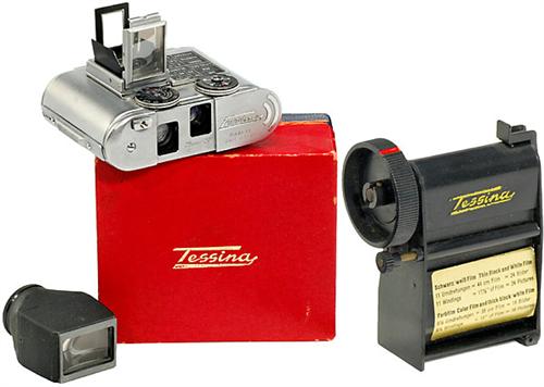 "Tessina" Concava, Lugano, "Tessina", no. 464549, chrome, high-precision Swiss made camera for film format 14 x 21 mm on 35-mm film, later improved model with black dials, complete with optical viewfinder. - And: Tessina Daylight Film Loader, box and rare viewing magnifier!<Br>