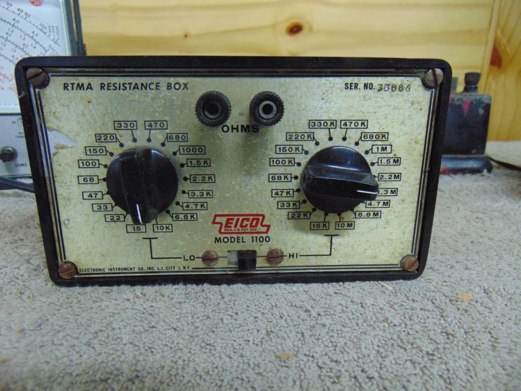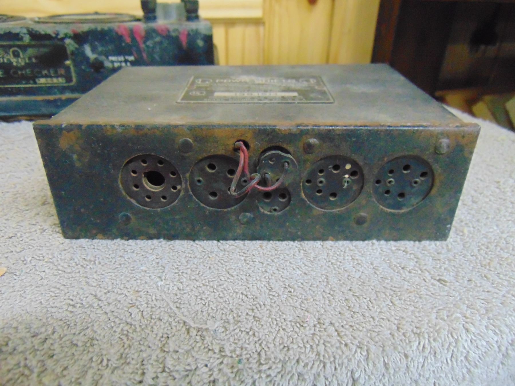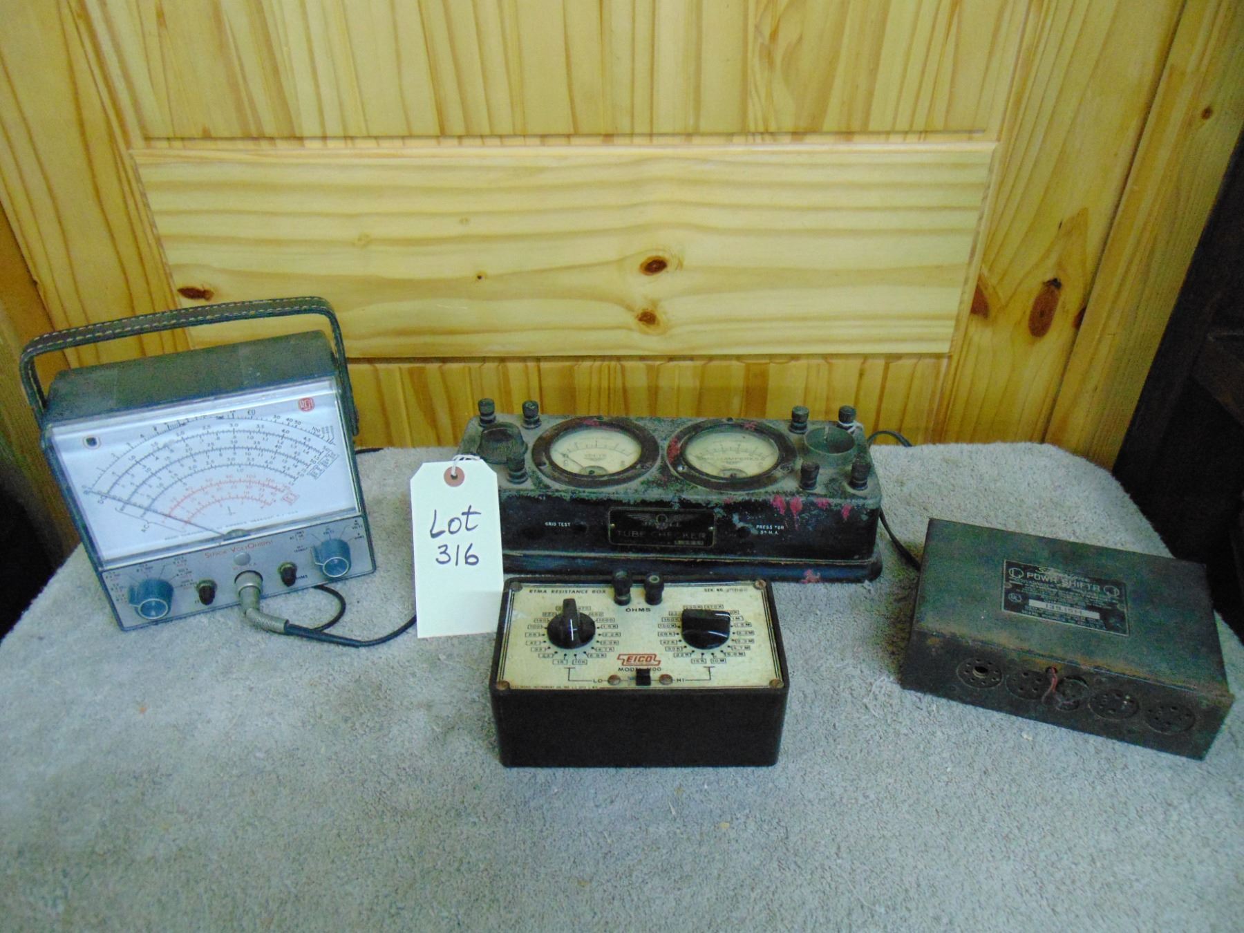 Four items: 1) RCA Sr. voltohmyst; 2) Eico resistance box; 3) Silvertone farm set power supply; 4) early Jewell tube tester
