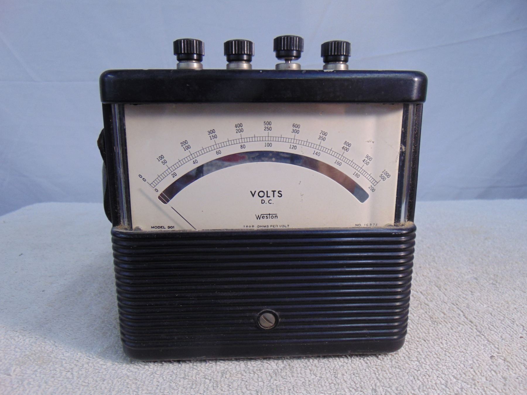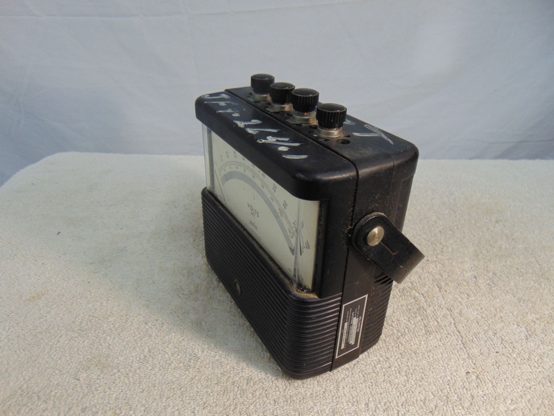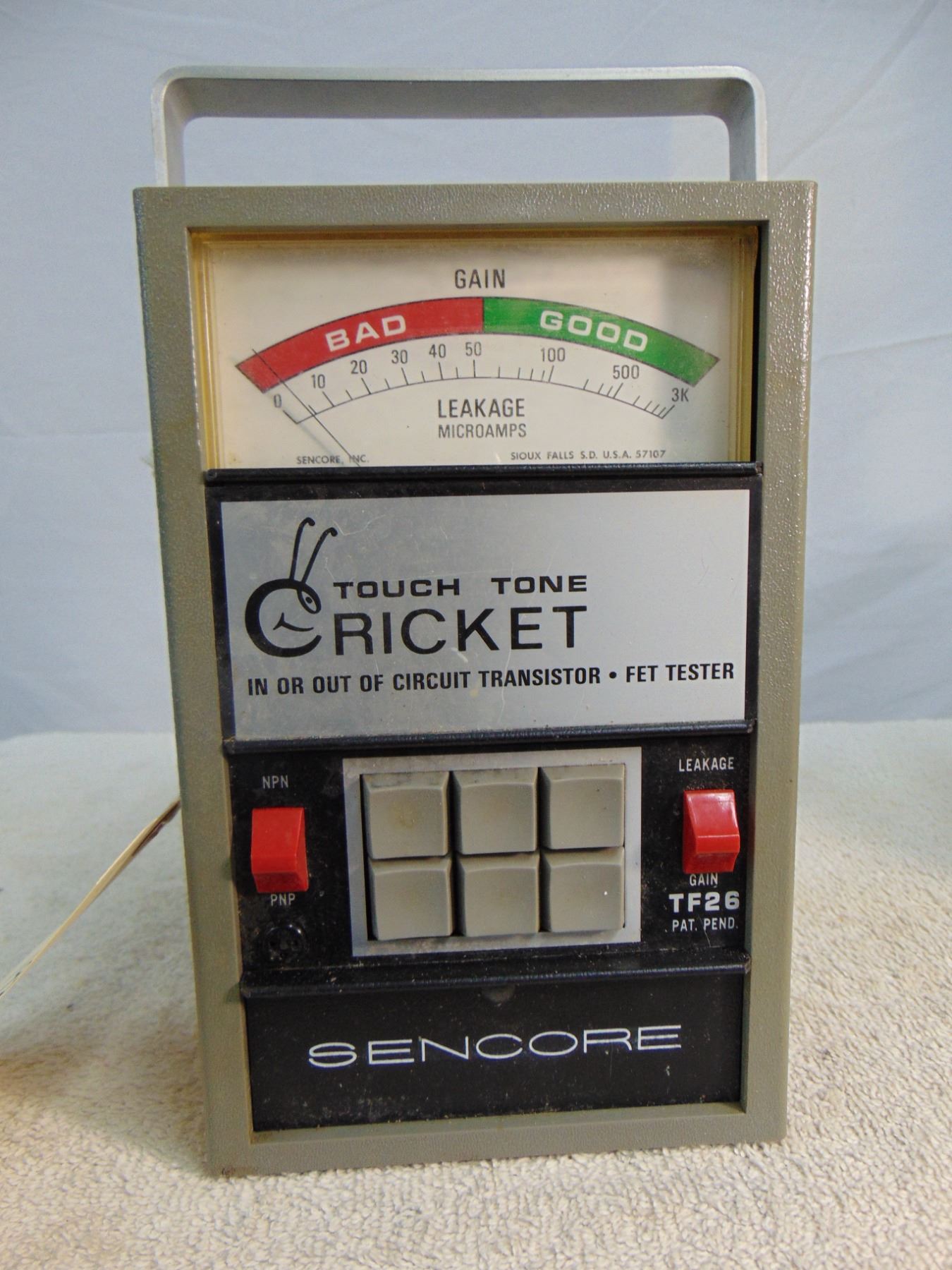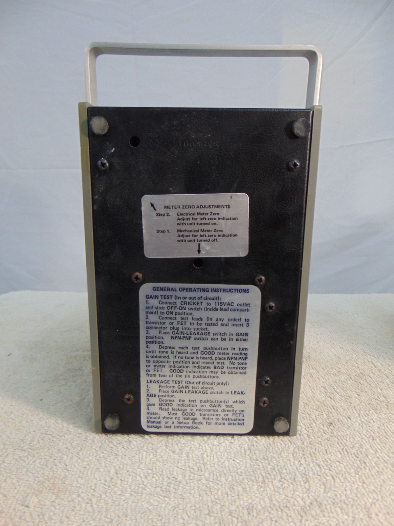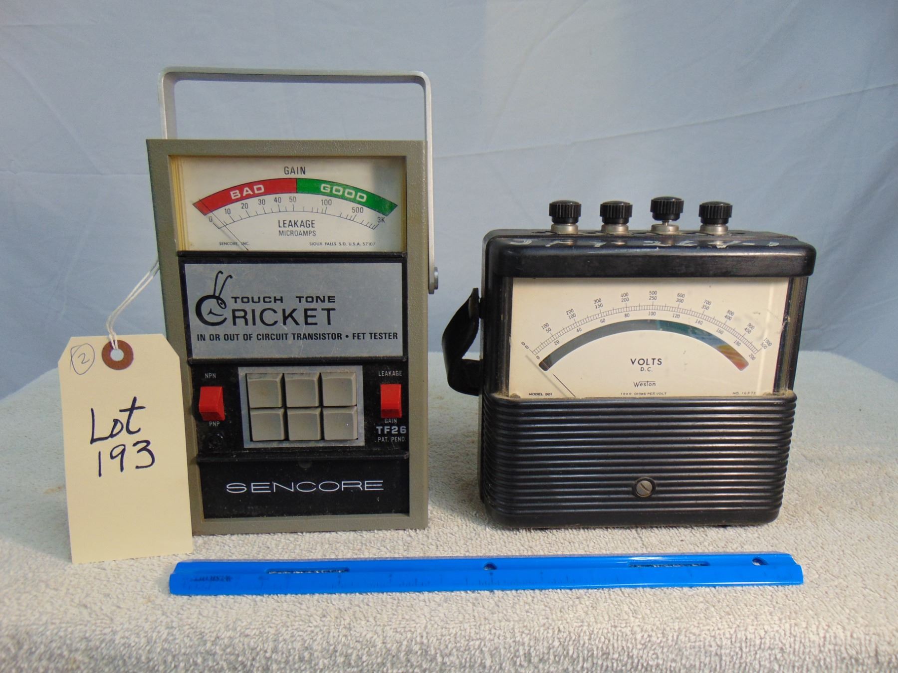 Two items: 1) Sencore Cricket transistor tester, model TF-26; 2) Weston DC voltmeter, mirrored movement