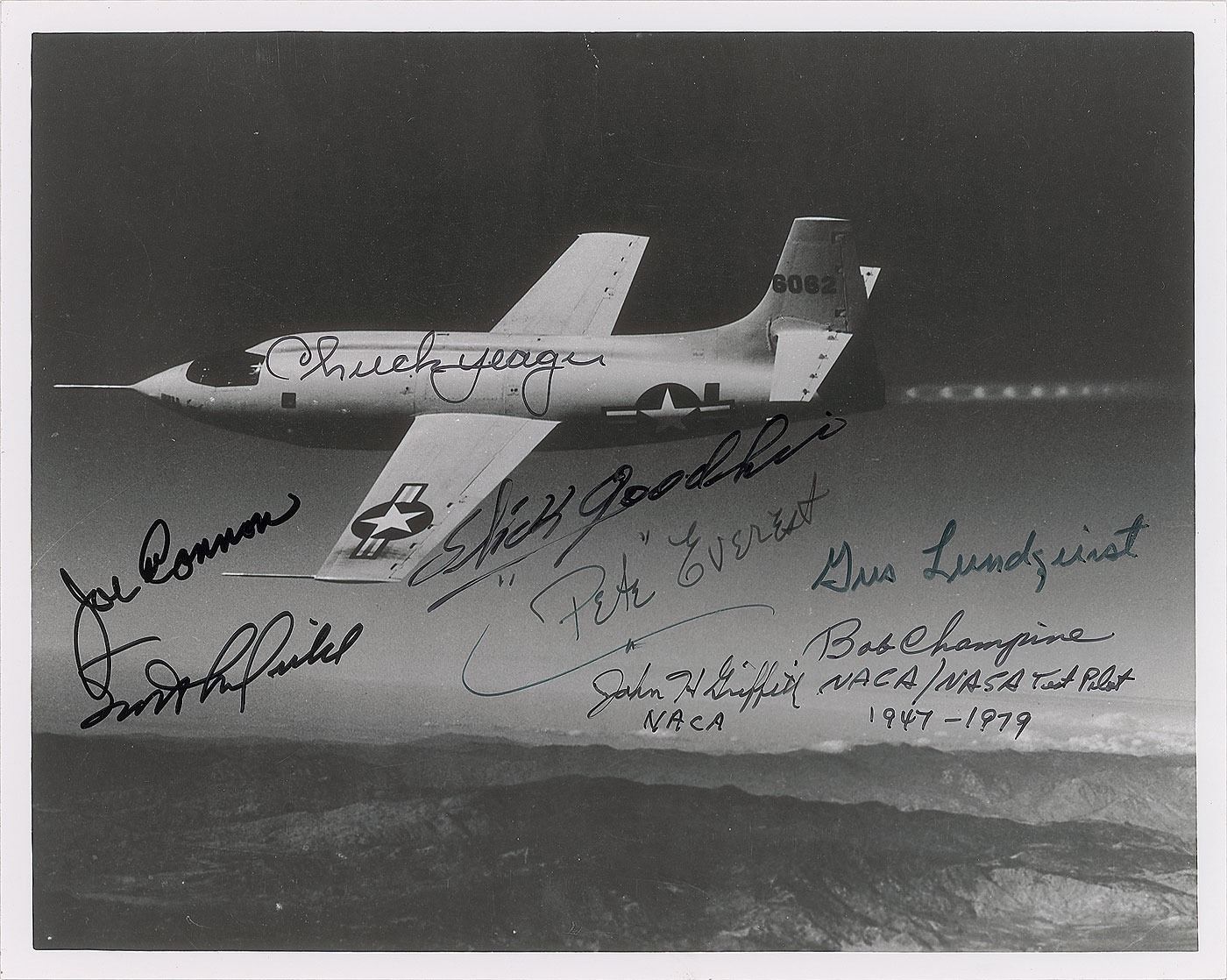 Excellent glossy 10 x 8 photo of a soaring Bell X1-6062 aircraft, signed in black felt tip by eight legendary test pilots: "Chuck Yeager," "Joe Cannon," "Scott Crossfield," "[Chalmers] Slick Goodlin," "[Frank Kendall] 'Pete' Everest," "John H. Griffith, NACA," "Gus Lundquist," and "Bob Champine, NACA/NASA Test Pilot, 1947–1979." In very fine condition.
