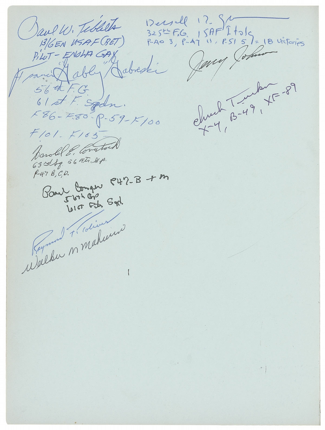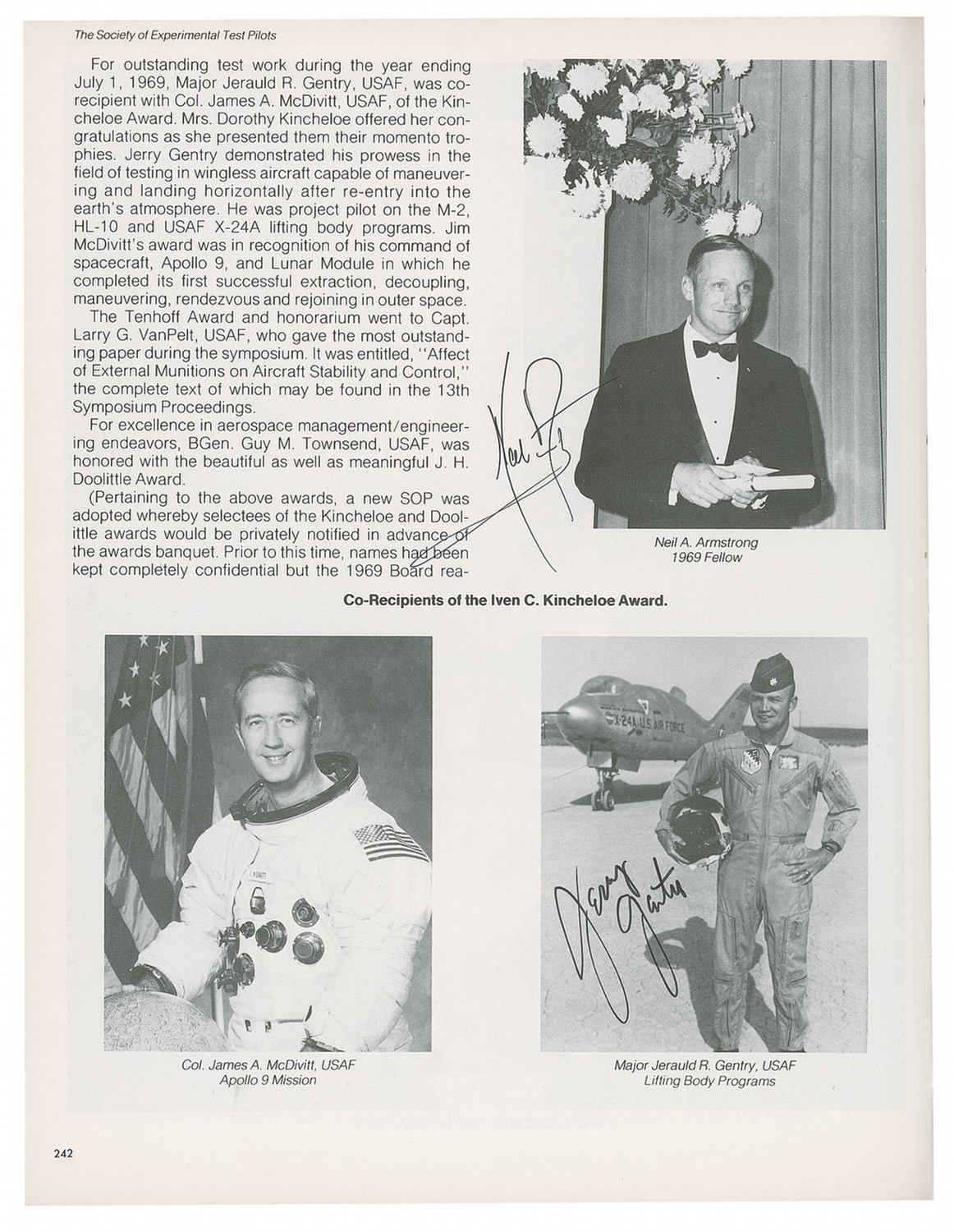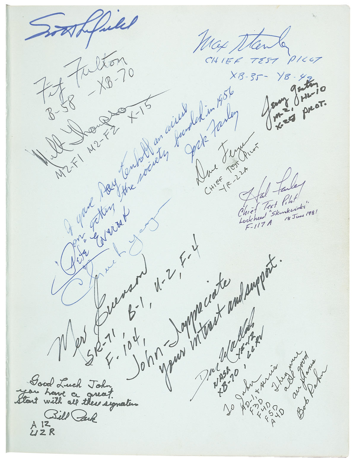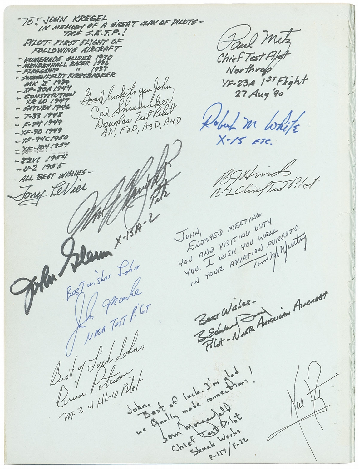 Signed book: The Society of Experimental Test Pilots History. First edition. Covina, California: Taylor Publishing Company, 1978. Hardcover, 9 x 11.5, 400 pages. Signed in ballpoint and by 97 test pilots and aviation pioneers on the inside covers, the first or last free end pages, or on their respective image on an interior page. Signers include: Neil Armstrong (signed twice—once on the inside board and again on an inside page), John Glenn, Paul Tibbets, Chuck Yeager, Pete Knight, Paul Metz, Robert White, Cal Shoemaker, Bruce Hinds, John Manke, Tom McMurtry, Bruce Peterson, Tom Morganfield, Scott Crossfield, Fitz Fulton, Milt Thompson, Max Stanley, Jerry Gentry, Jack Farley, Dave Ferguson, Pete Everest, Hal Farley, Gabby Gabreski, Bunny Comstock, Paul Conger, Jerry Johnson, Chuck Tucker, Al White, Bill Dana, Dick Rutan, C. E. ‘Bud’ Anderson, Joe Cotton, and Robert Gilliand. Several of the signatures are inscribed and many of the men have added mission assignments or other pertinent information. Corner bumps, wear and ink marks along the front hinge, and partial separation along the inside hinge of the front and back boards, and a bit of scattered soiling, otherwise fine condition.