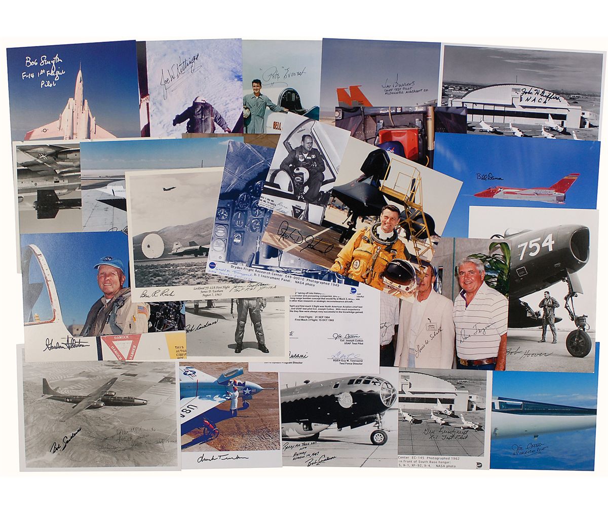 Twenty-four signed photos, almost all 8 x 10 or 10 x 8, various finishes, each signed in ink or felt tip by the respective test pilot or technician pictured. Signers include: Bill Dana, Robert Cardenas, Pete Everest, Gordon Fullerton, Paul MacCready, Bob Smyth, Ben R. Rich and Jim Eastham, Bob Hoover, Gerald Truszynski, Rogers Smith, Al White, Gus Lundquist, Joe Kittinger, John Griffith, Joe Cotton, and Jack Allavie. In overall fine condition, with one photo bearing a printed Glen Edwards signature.