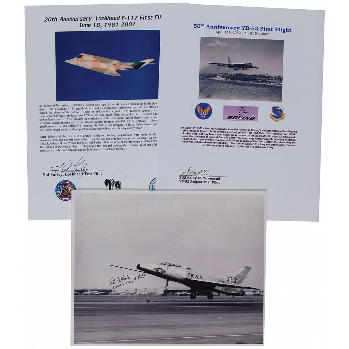 Three items: glossy 10 x 8 photo of the F-100C on its first flight takeoff, signed in black felt tip by Al White; a color 8.5 x 11 commemorative sheet honoring the 20th anniversary of the Lockheed F-117 first flight, signed in black felt tip by Hal Farley; and a color 8.5 x 11 commemorative sheet honoring the 50th anniversary of the YB-52 first flight, signed by Guy M. Townsend. In fine condition.