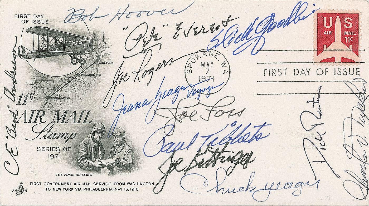 Impressive FDC with a cachet honoring the 11-cent Air Mail Stamp, Series of 1971, signed in various ink types by thirteen legendary pilots, including: Chuck Yeager, Paul Tibbets, Joe Kittinger, Bob Hoover, Frank 'Pete' Everest, Jeana Yeager, Dick Rutan, Charles Tucker, Joe Foss, Chalmers 'Slick' Goodlin, Joe Rogers, and Bud Anderson. In fine condition.