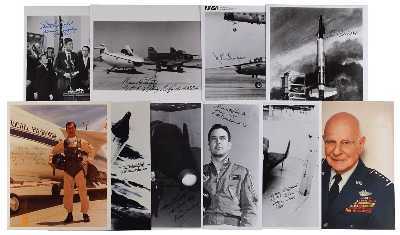 Group of ten photos signed by noted test pilots, mostly representing the X-20 Dyna-Soar program, 8 x 10 and 10 x 8, including: Scott Crossfield, Bruce Peterson, Gary E. Krier (ins), Milt Thompson, Al Crews, James W. Wood, Hank Hartsfield, William J. Knight, Henry C. Gordon, and James H. Doolittle. In overall fine condition.
