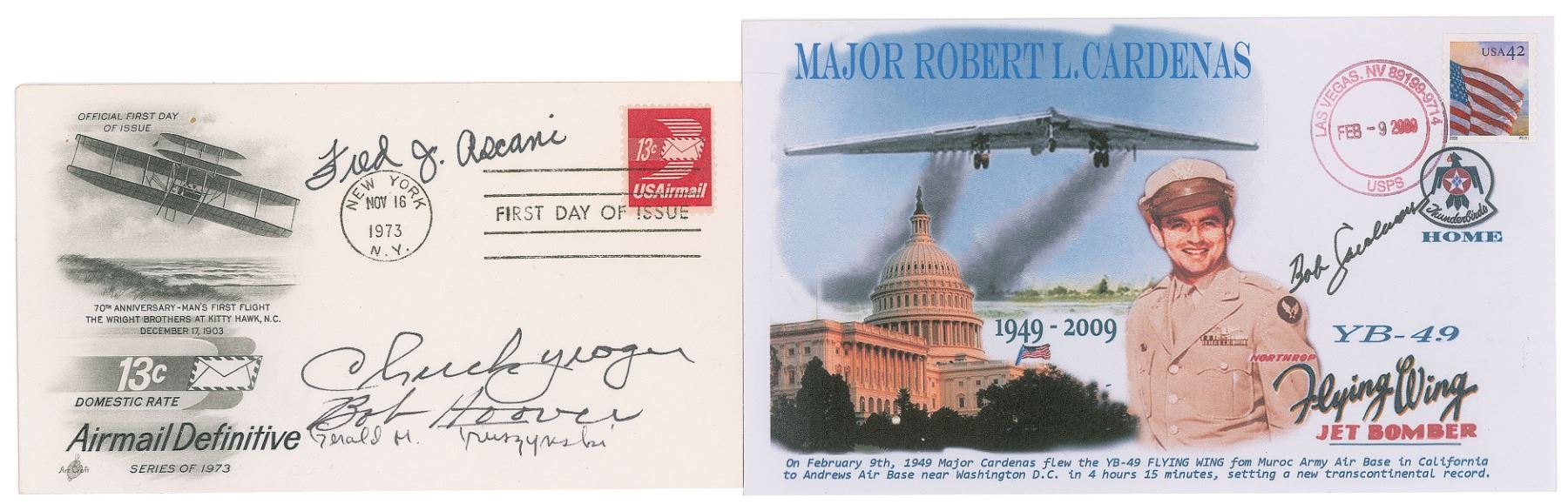 Two covers signed by one or more notable test pilots or engineers: an FDC with a cachet honoring the 70th anniversary of the Wright Brothers' first flight at Kitty Hawk, signed in ink by Chuck Yeager, Fred Ascani, Bob Hoover, and engineer Gerald M. Truszynski, whose signature remains quite rare; and a commemorative cover with color cachet honoring General Robert 'Bob' Cardenas, who signs in black ink. In overall fine condition.