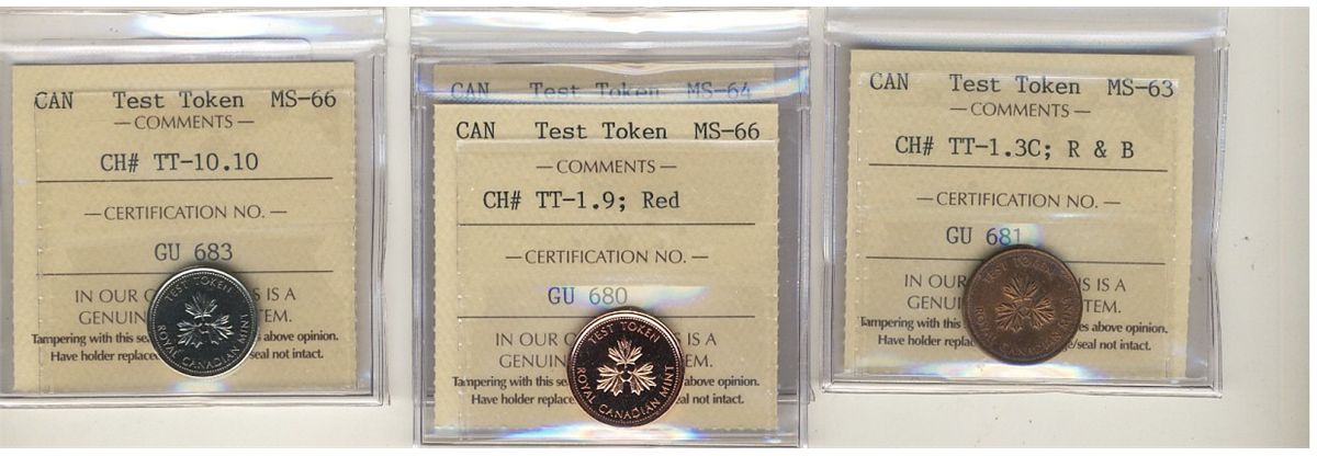 Test Token CH# TT-1.3C MS63RB, TT-1.9 MS66RD, TT-10,10 MS66 & TT-10.1B. Lot of 4 ICCS graded coins.